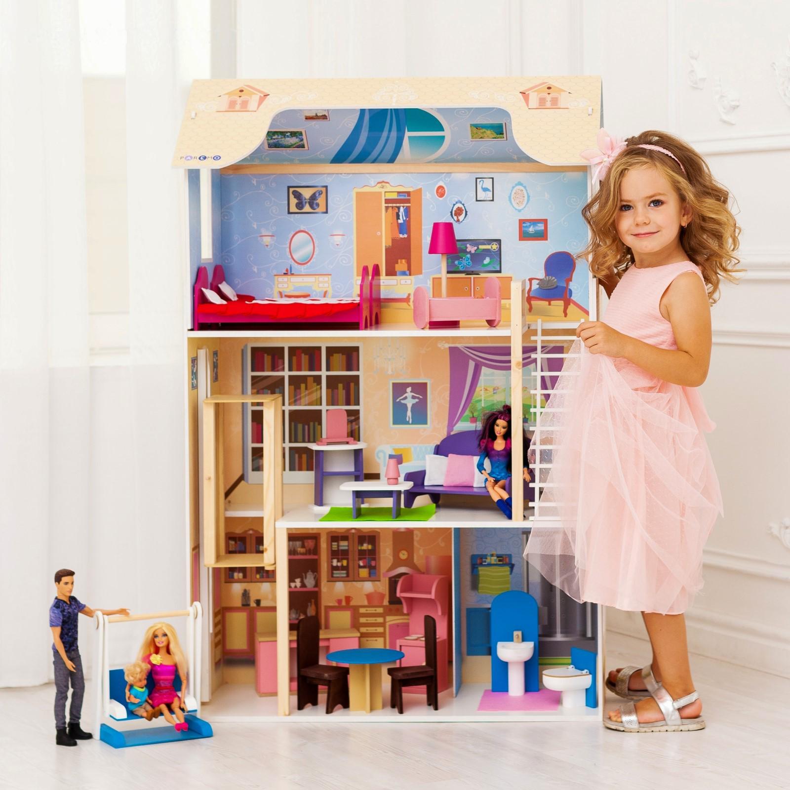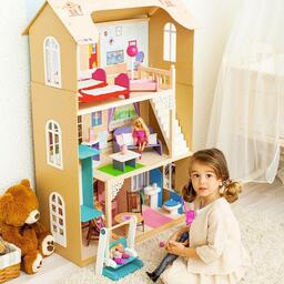Домик для кукол — это мечта любой девочки, и вы можете её осуществить. В игрушечном коттедже 4 этажа, между ними есть лестница и лифт. Конструкция частично открыта: ребёнку доступны все зоны с лицевой стороны. Благодаря тому, что кукольное жилище полностью декорировано и укомплектовано, ничего не помешает приступить к игре сразу после сборки. В инструкции подробно расписана последовательность соединения элементов.