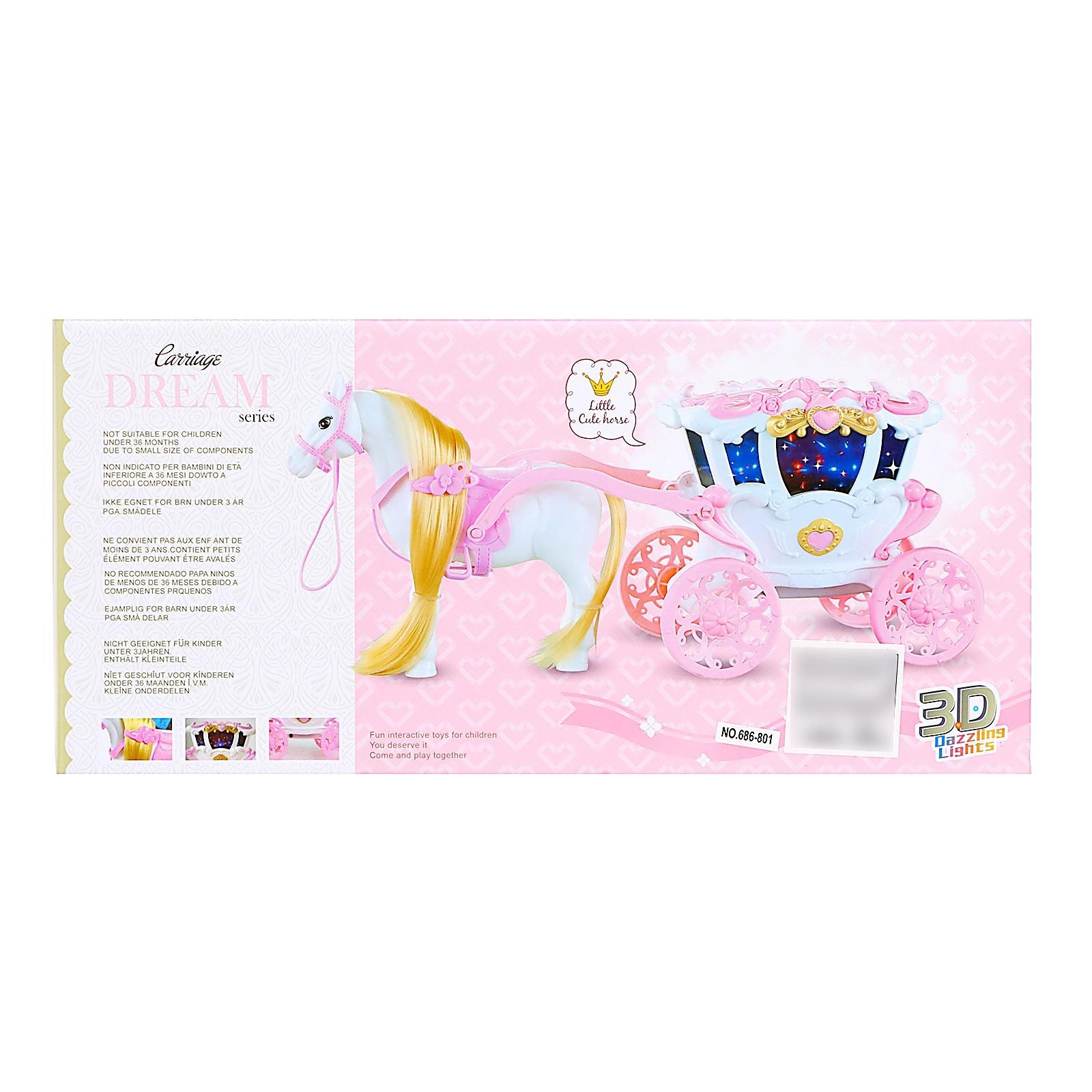 Лошадь можно отсоединить от упряжки и кареты и играть с ней отдельно. Высота кареты составляет 15,5 см, лошадки — 16 см. Карета светится и воспроизводит весёлую музыку. Для игры вам понадобятся 3 батарейки типа LR44 (V13GA, AG13, LR1154), входят в комплект.