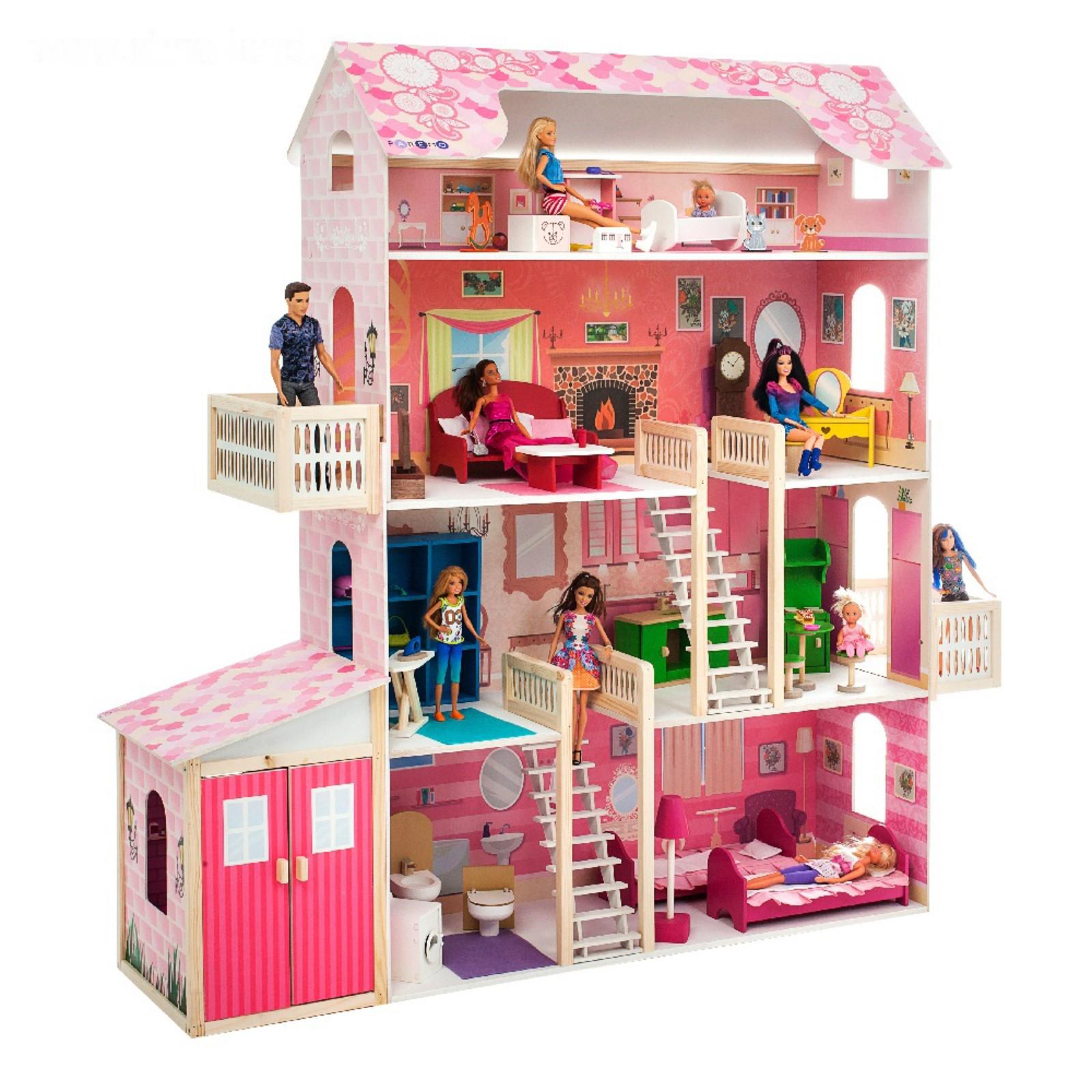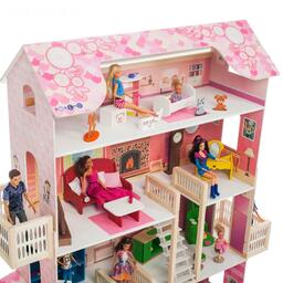 Домик для кукол — это мечта любой девочки, и вы можете её осуществить. В игрушечном коттедже 4 этажа, между ними есть 2 лестницы с имитацией коврового покрытия, что придаёт интерьеру реалистичность. Конструкция частично открыта: ребёнку доступны все зоны с лицевой стороны. На втором и третьем уровне имеются балконы.