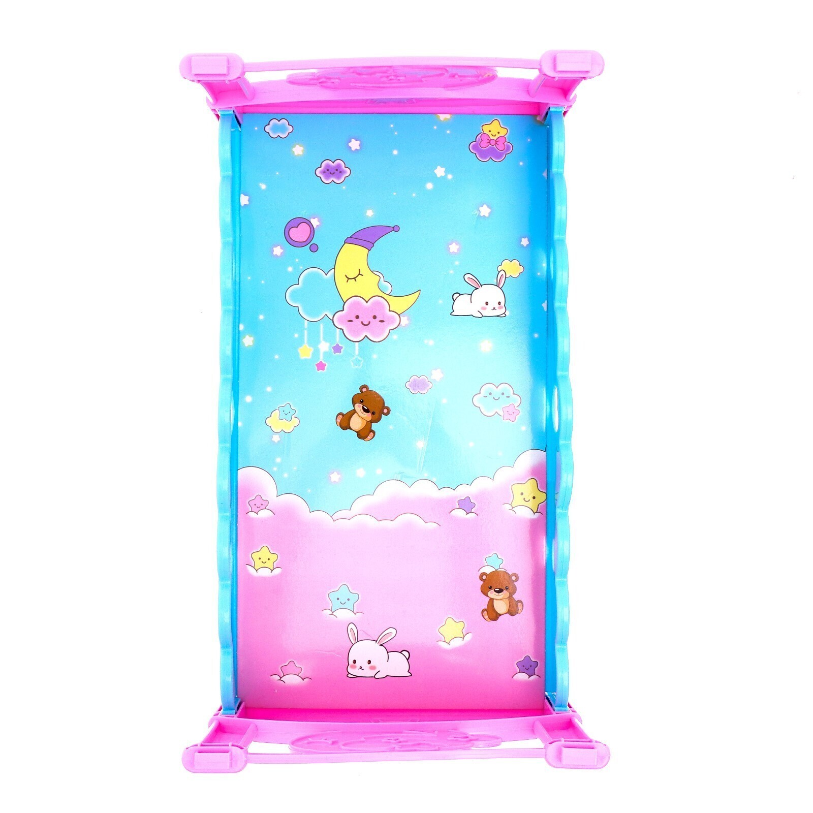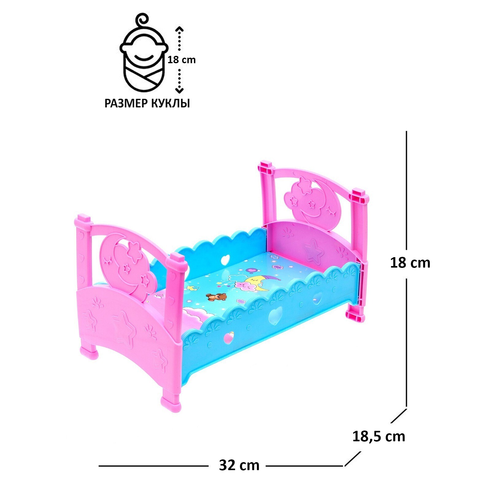 Кроватка для куклы дополнит интерьер детской комнаты. Каркас прочный, выполнен из пластика, дно — из картона. Для детей старше 3 лет.