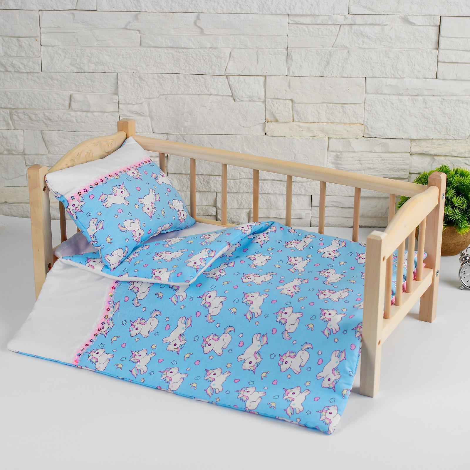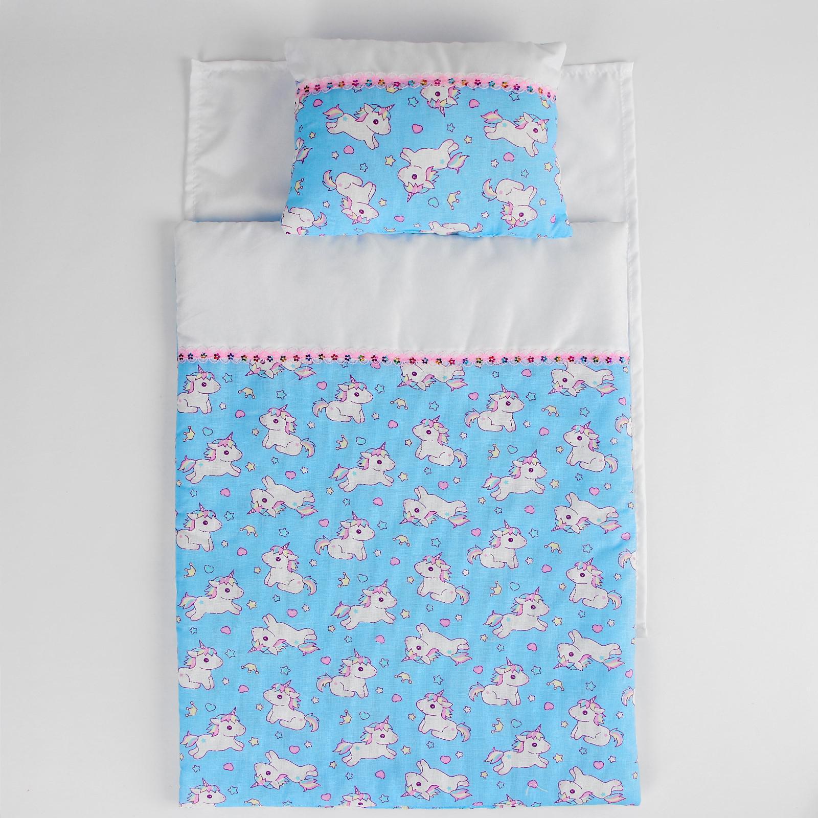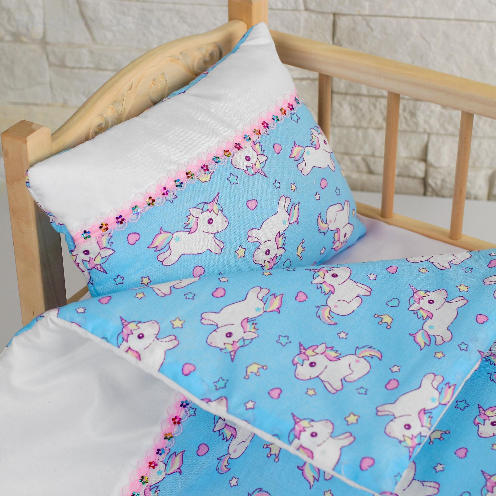 Постельное бельё для кукол «Единорожки на голубом», простынь, одеяло, подушка