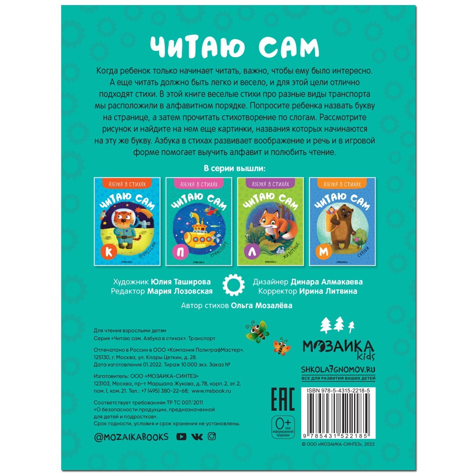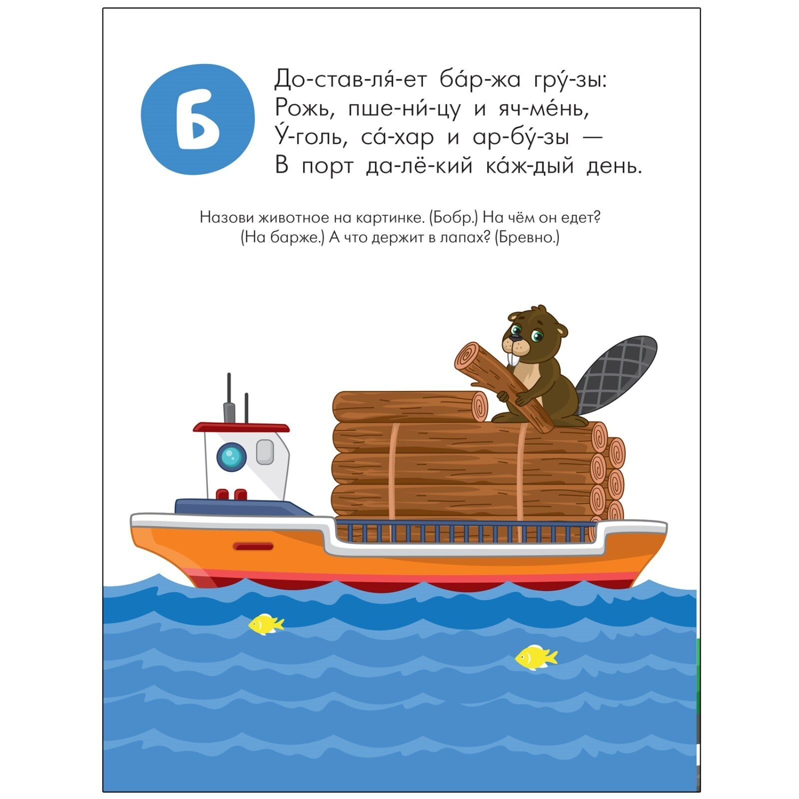 В книге «Транспорт» ребенка ждут стихи про разные виды транспорта, расположенные в алфавитном порядке, — одна страничка, одна буква и одно стихотворение. Слова разделены на слоги, в них проставлены ударения — для более комфортного чтения. Кроме того, помимо тренировки навыка чтения, ребенку предлагается проверить свою внимательность: рассмотреть рисунок и найти на нем еще картинки, названия которых начинаются на эту же букву.