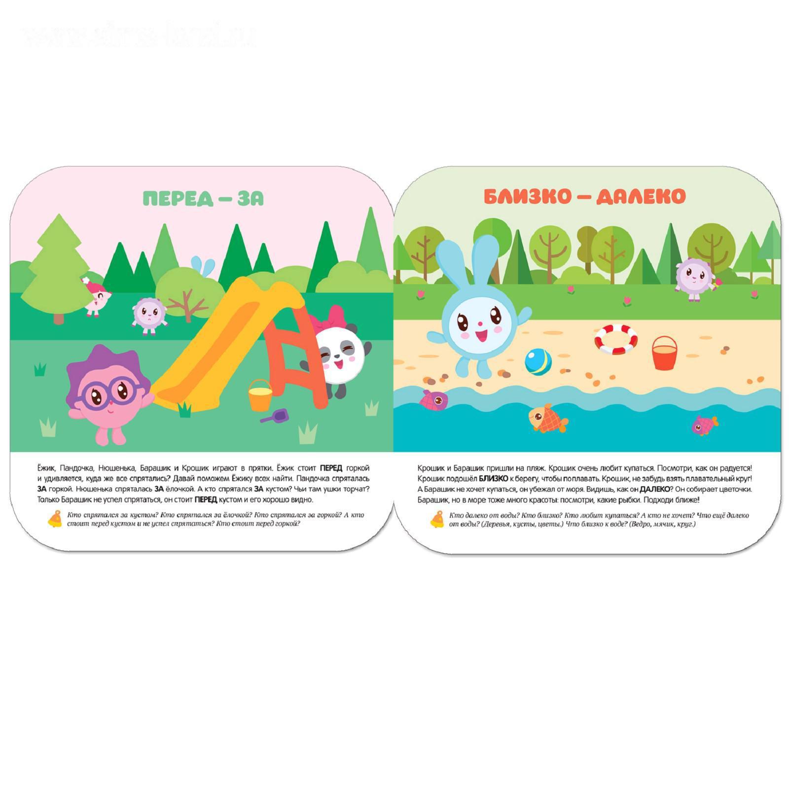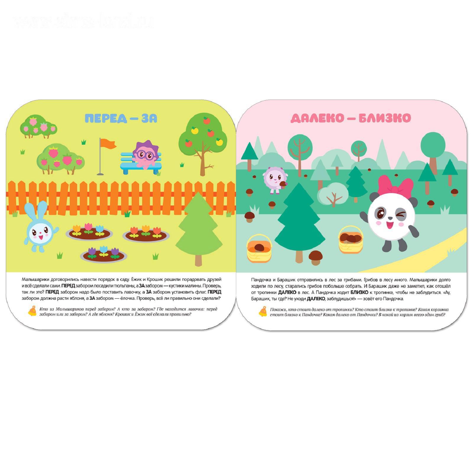 На страницах книги вы найдете красочные сюжетные картинки о жизни Малышариков. Рассматривая и обсуждая их с ребенком, вы поможете ему развить пространственное мышление, математические способности и речь, закрепить знание предлогов.