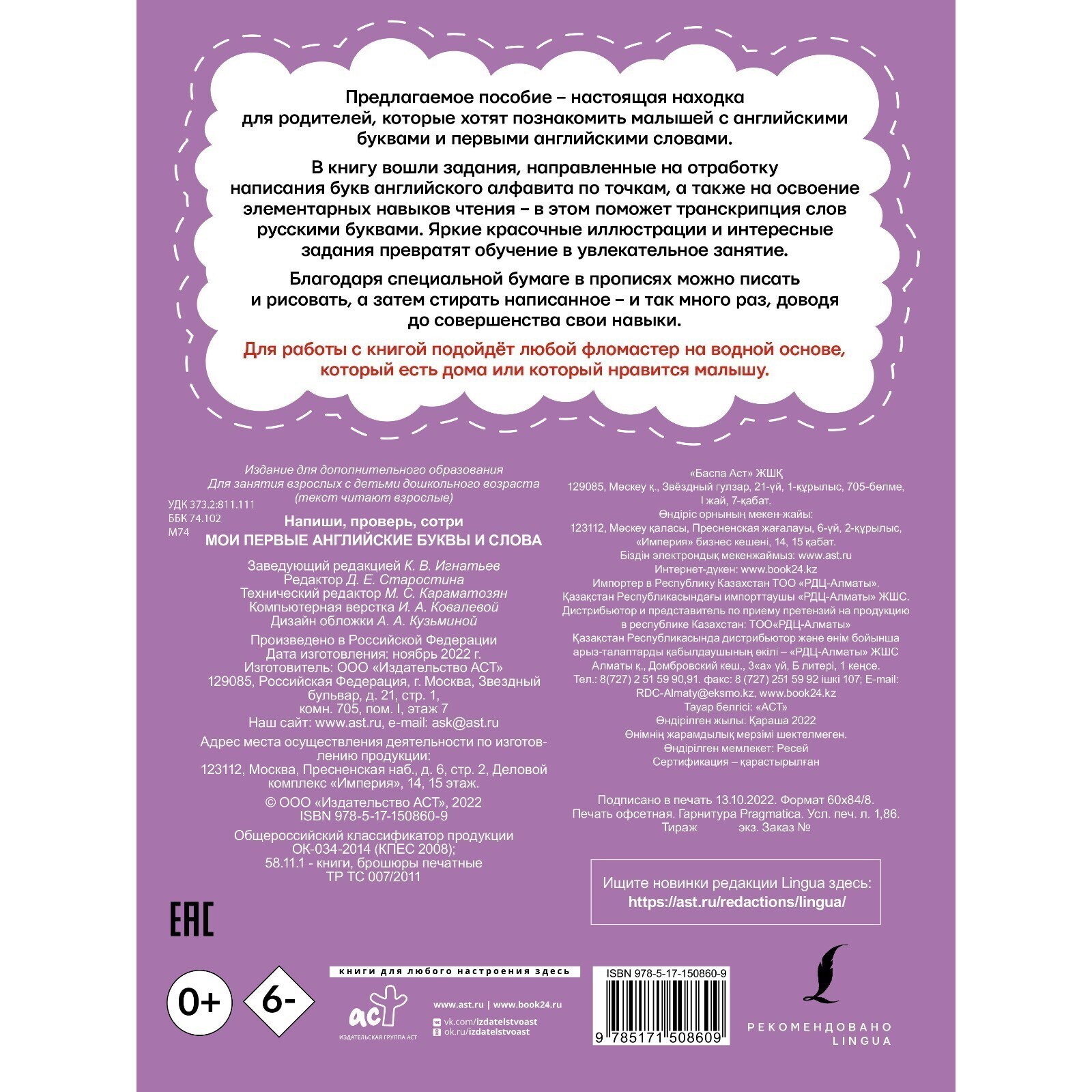 Предлагаемая книга – настоящая находка для родителей, которые хотят познакомить малышей с английскими буквами и первыми английскими словами. В книгу вошли задания, направленные на отработку написания букв английского алфавита по точкам, а также на освоение элементарных навыков чтения – в этом поможет транскрипция слов русскими буквами. Яркие красочные иллюстрации и интересные задания превратят обучение в увлекательное занятие. Благодаря специальной бумаге в прописях можно писать и рисовать, а затем стирать написанное – и так много раз, доводя до совершенства свои навыки. Для работы с книгой подойдёт любой фломастер на водной основе, который есть дома или который нравится малышу.