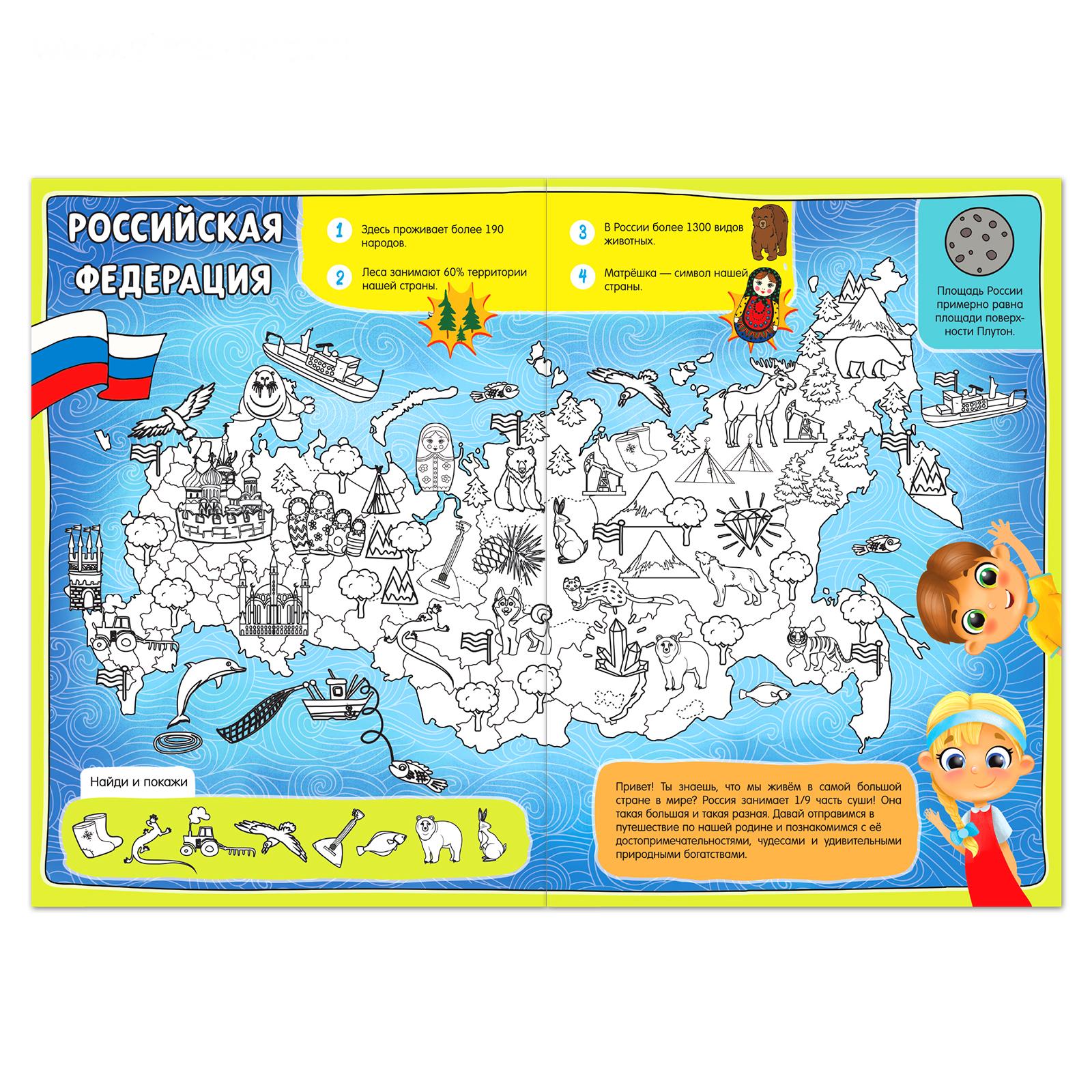 На каждой странице представлены яркие картинки с изображениями карты нашей страны, достопримечательностей и других предметов.