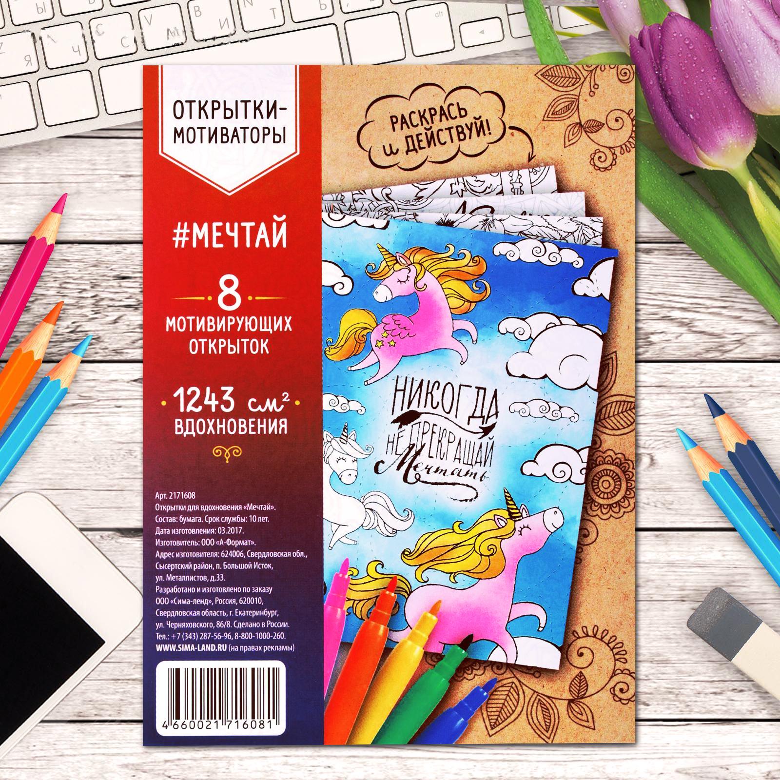В набор входят 8 мотивирующих картинок для раскрашивания с оборотной стороной почтовой открытки.