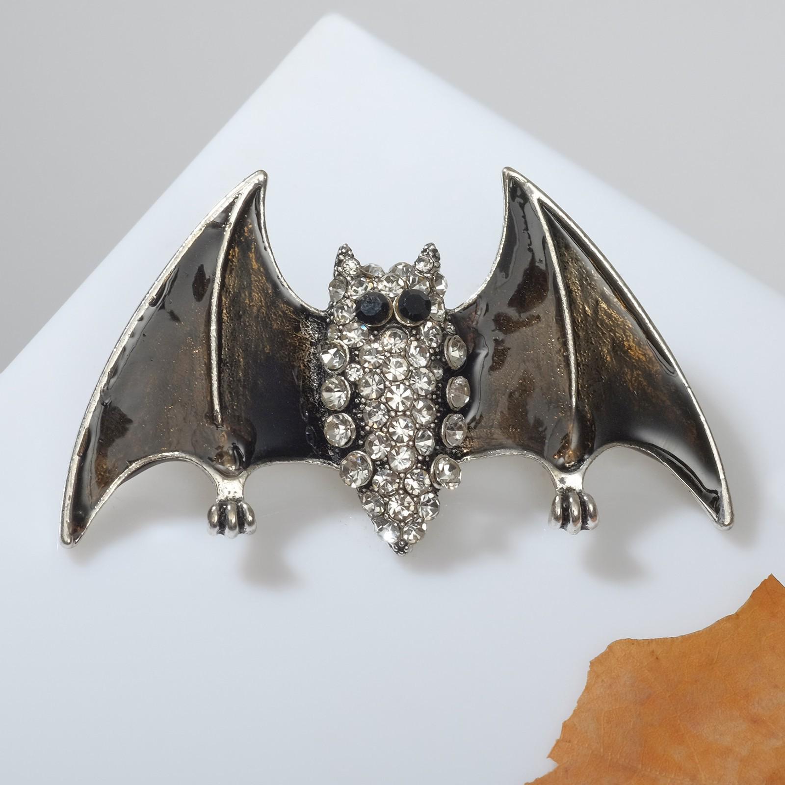 Брошь "Хэллоуин" летучая мышь, цвет чёрно-белый в серебре