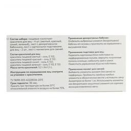 Состав: Краситель пищевой золотой жёлтый: соль, красители: Е102, Е171, Е172, Е122, Е110, агент антислёживающий Е555; масса нетто - 1,3 г. Краситель пищевой золотой красный: соль, красители: Е171, Е172, Е122, Е151, агент антислёживающий Е555; масса нетто - 1,3 г. Краситель пищевой золотой синий: соль, красители: Е171, Е172, Е133, агент антислёживающий Е555; масса нетто - 1,3 г. Краситель пищевой золотой зелёный: соль, красители:Е171, Е172, Е102, Е133, агент антислёживающий Е555; масса нетто - 1,3 г. Лист с декоративными наклейками (полипропилен) - 3 шт., лист с подставками под яйца (картон) - 2 шт., лист с манжетами для свечей (бумага) - 1 шт.