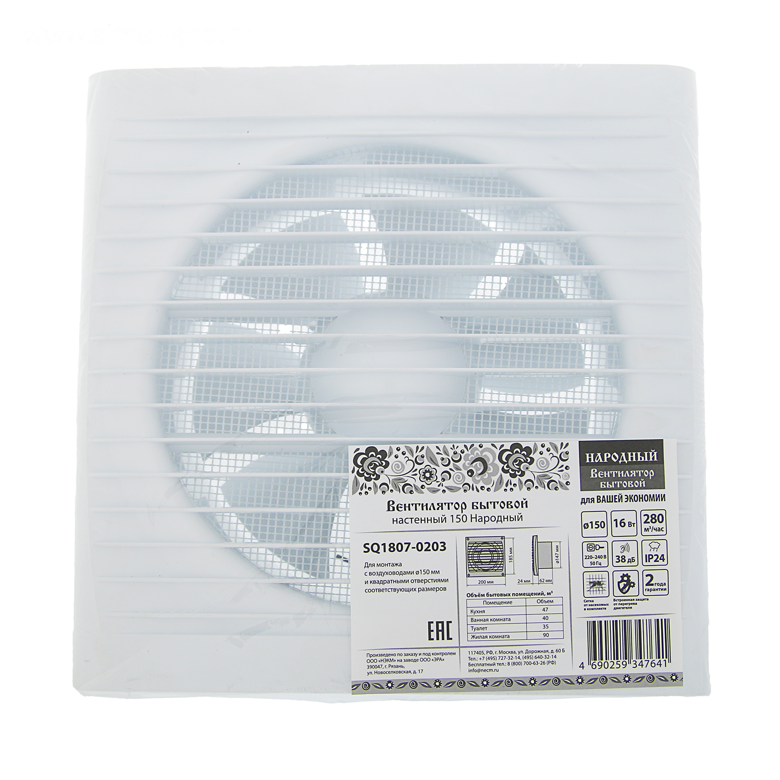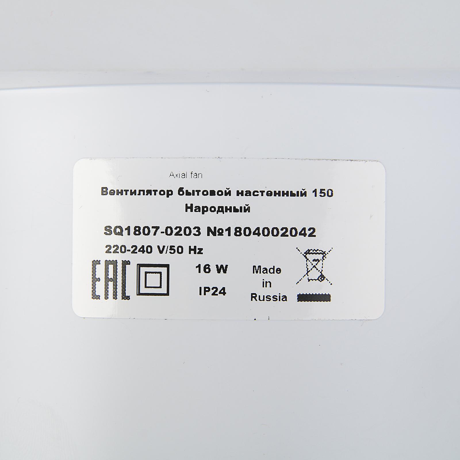 Вентилятор TDM «Народный 150» SQ1807-0203, 230 В, бытовой, настенный, d=150 мм, белый
