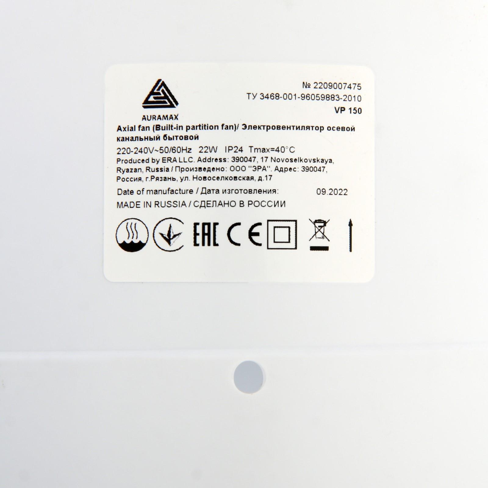 Вентилятор вытяжной AURAMAX VP 150, 153x153 мм, d=150 мм, 220 В, 22 Вт, 37 дБ, канальный