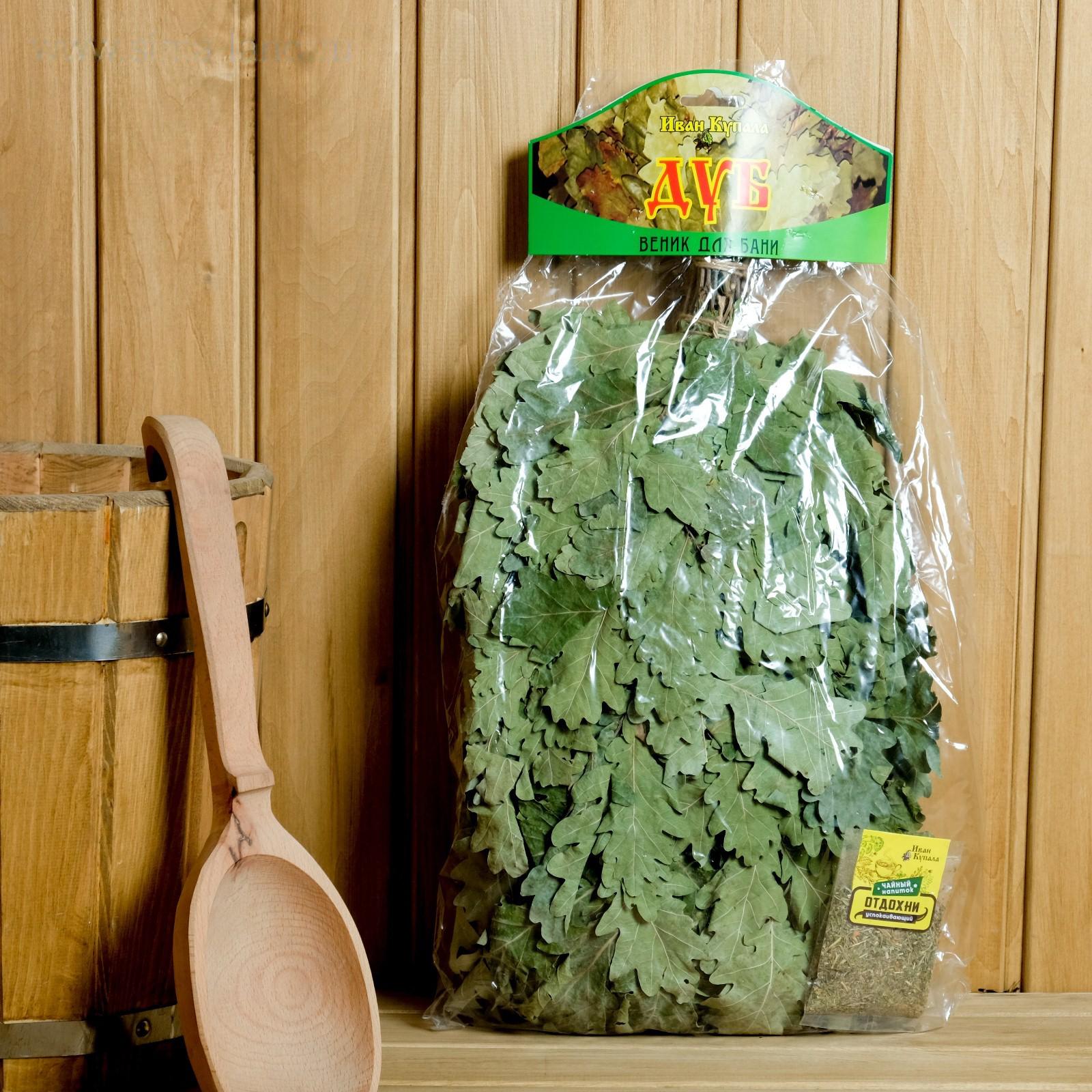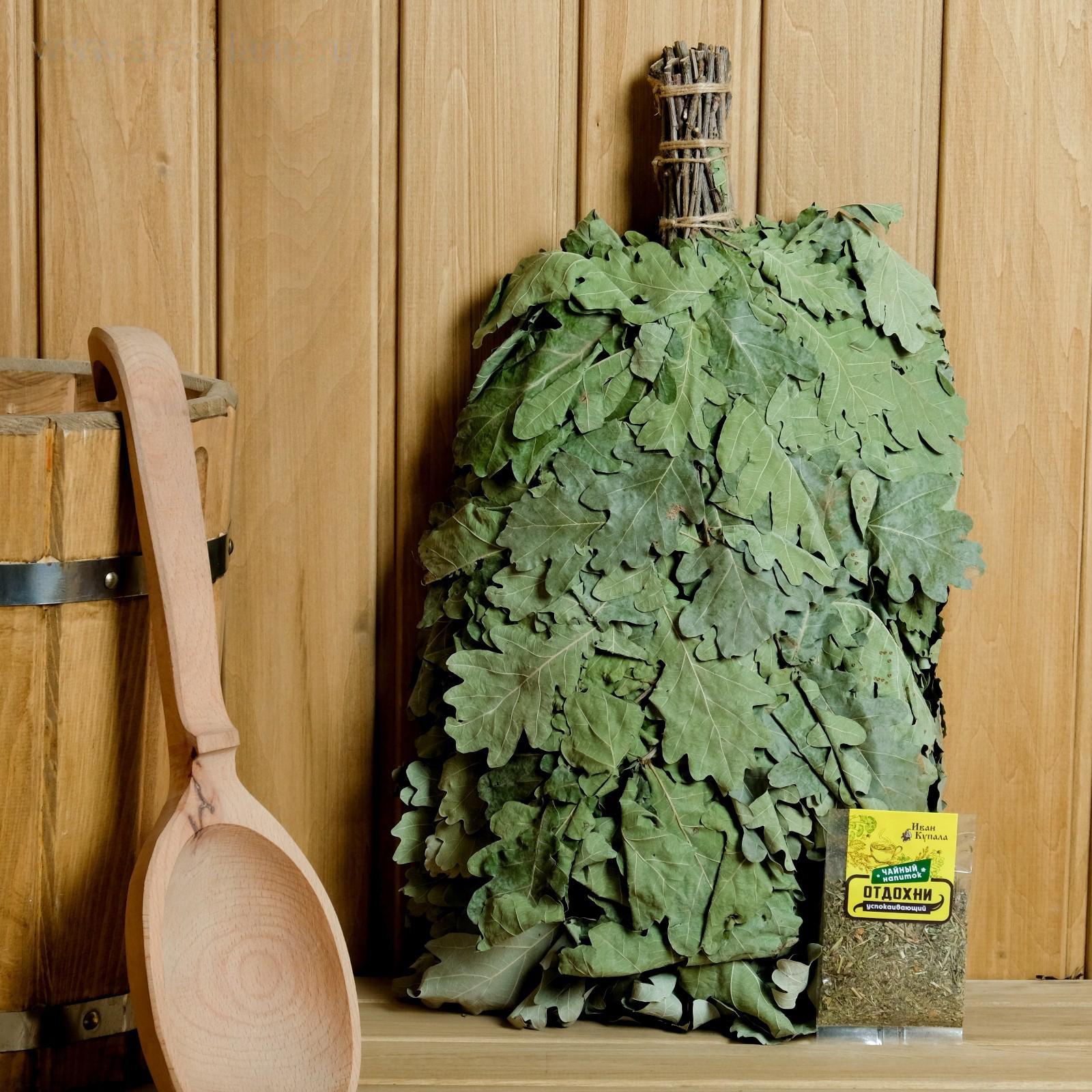 Набор веник ЭКСТРА из кавказского дуба с чайным напитком "Отдохни",в индивидуальной упаковке