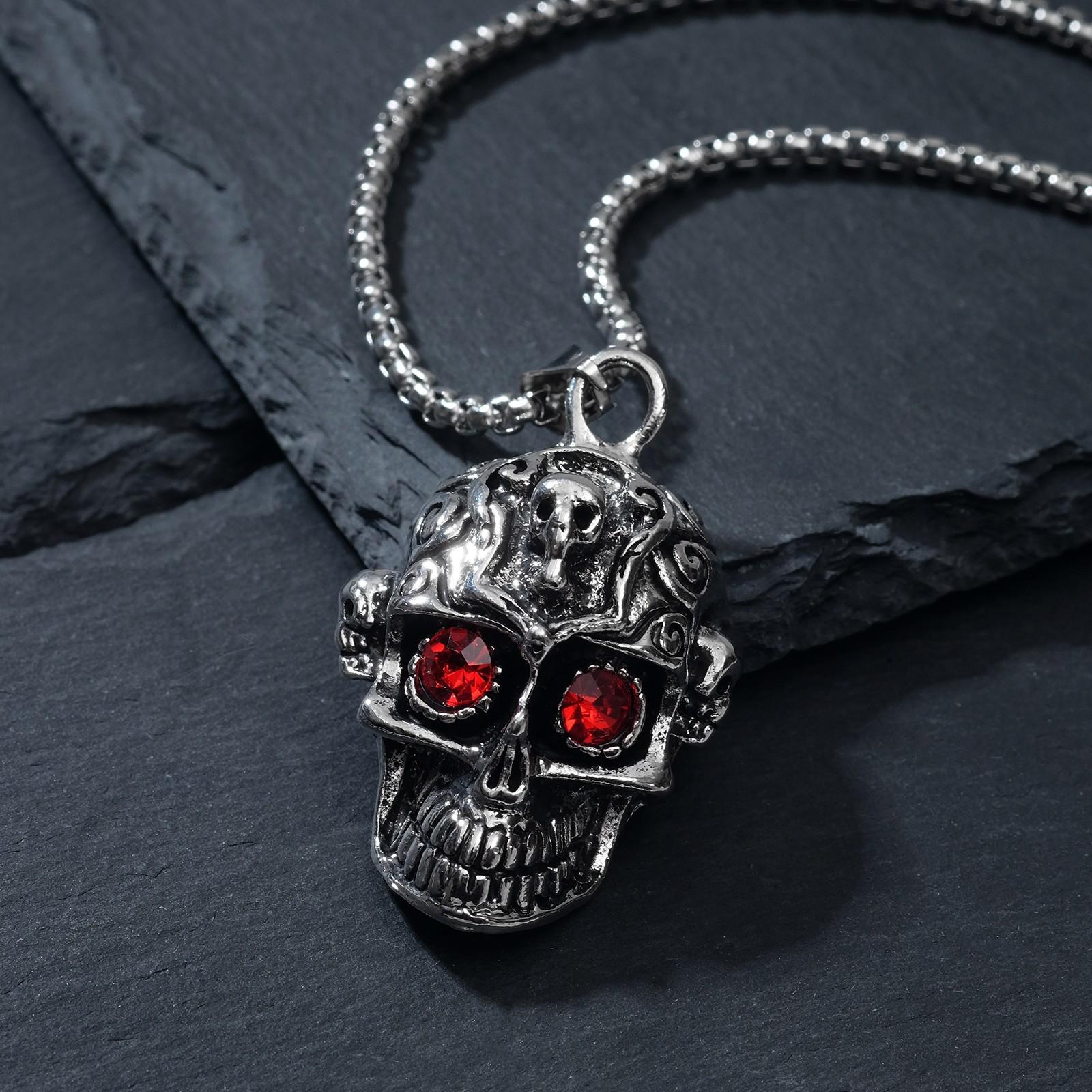 Кулон "Череп с узорами" яркие глаза, цвет красный в чернёном серебре, 70см