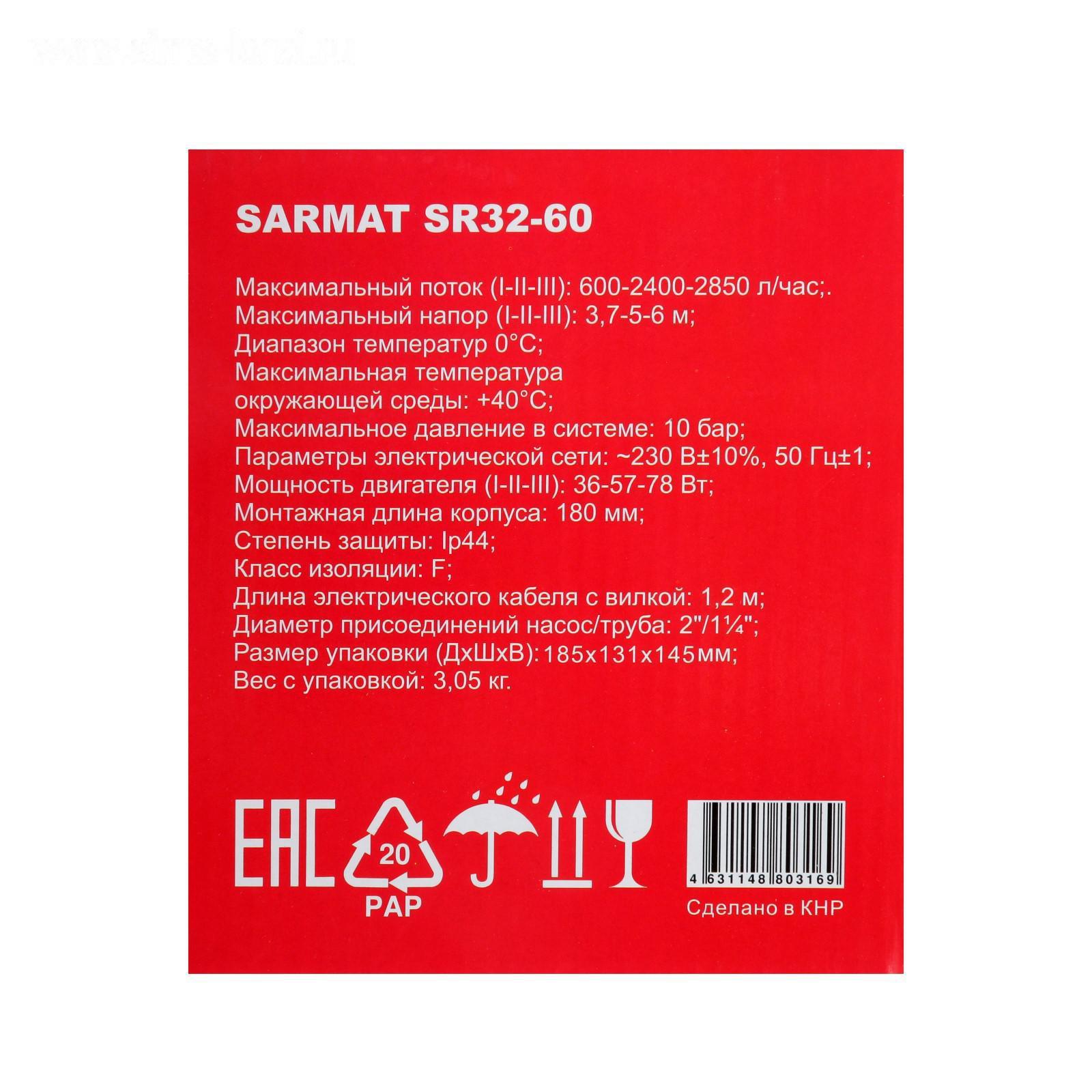 Насос циркуляционный SARMAT SR 32-60, 36/57/88 Вт, напор 6 м, кабель 1.2 м