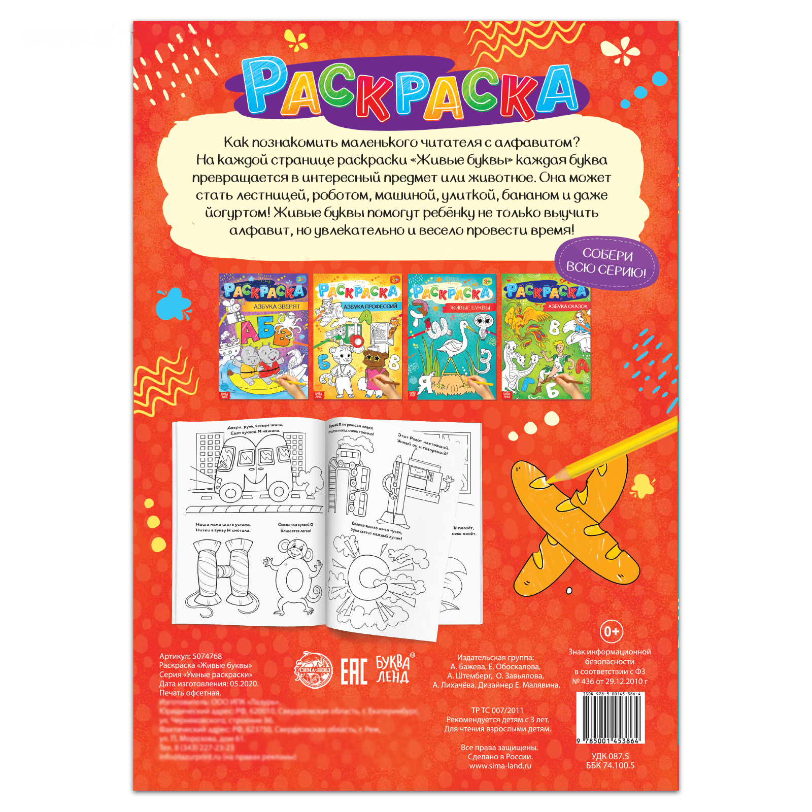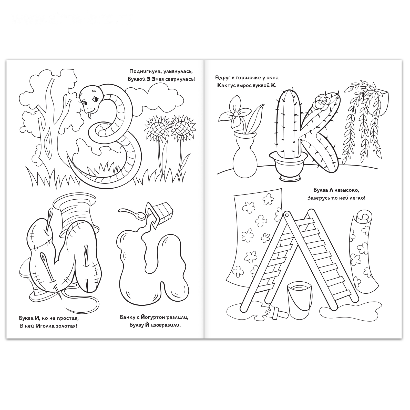 На каждой странице раскраски «Живые буквы» каждая буква превращается в интересный предмет или животное. Она может стать лестницей, роботом, машиной, улиткой, бананом и даже йогуртом!