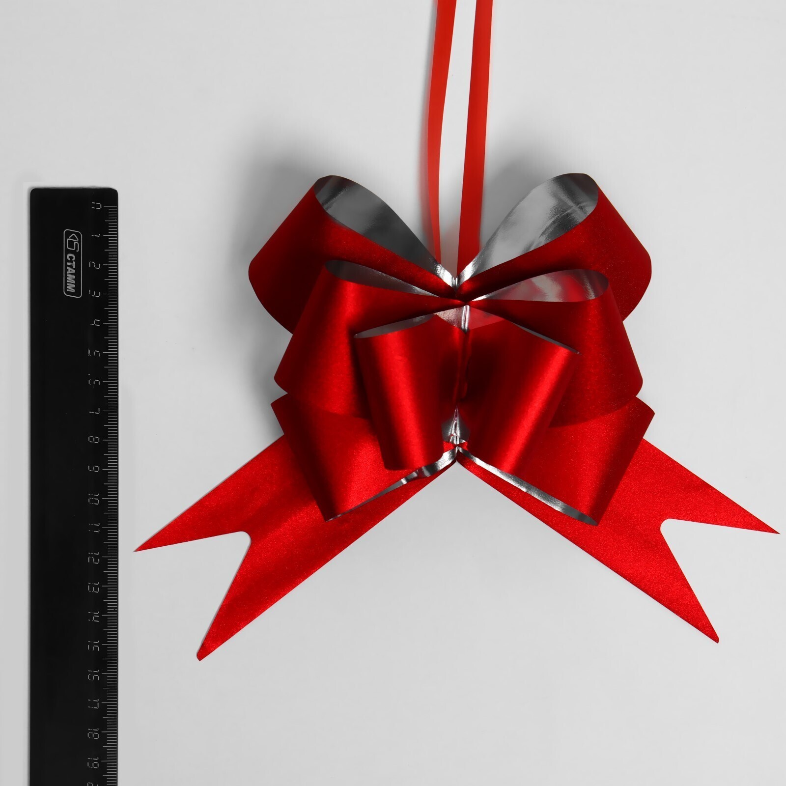 Для того чтобы собрать бант, надо потянуть за две ленточки, находящиеся между широкими лентами, удерживая широкие ленты в месте спайки.