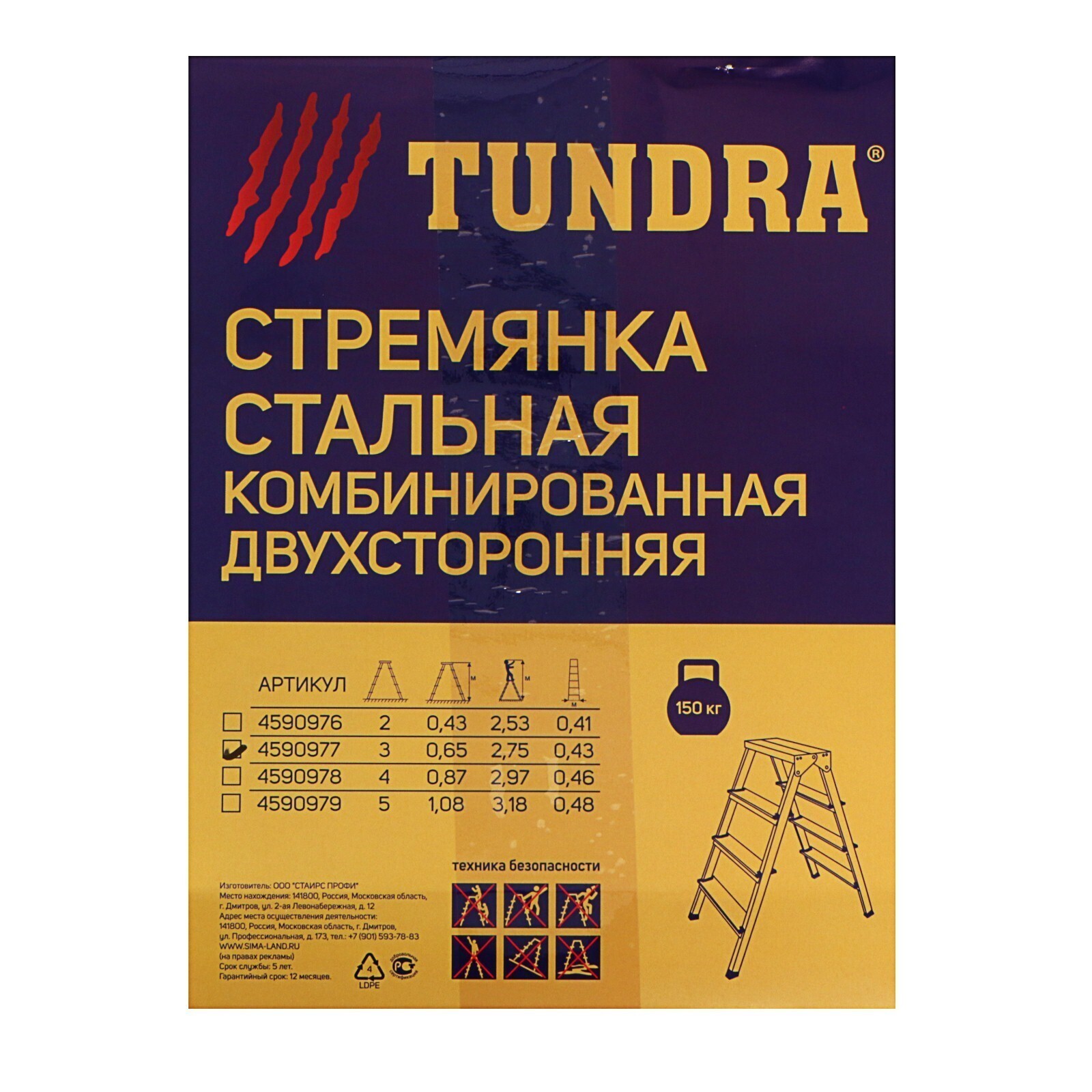 Стремянка ТУНДРА, комбинированная, двухсторонняя, 3 ступени, 650 мм