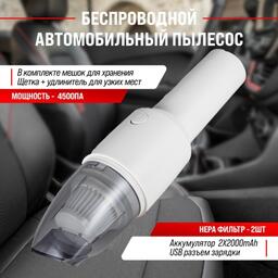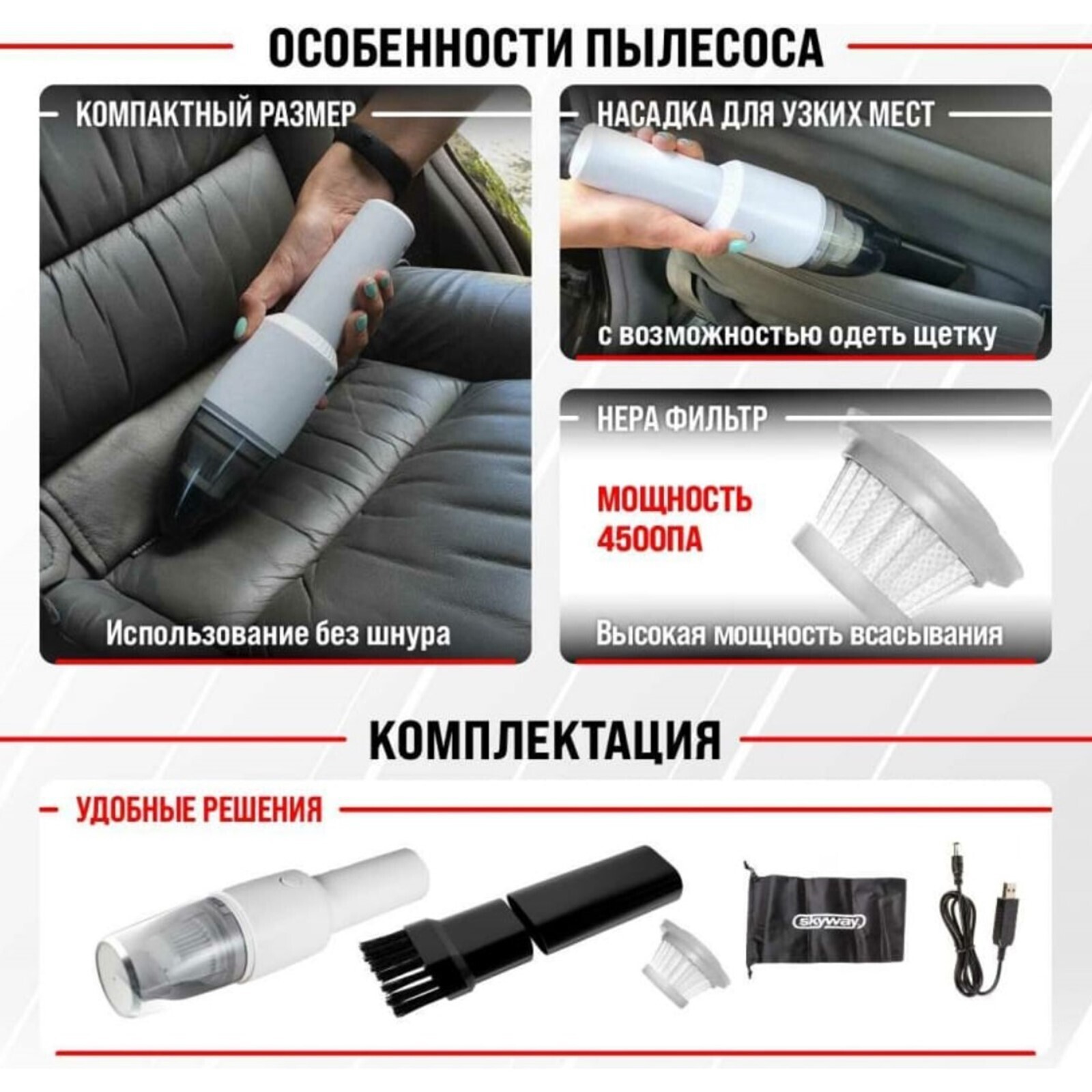 Пылесос SKYWAY ШТОРМ 4500Па 60W 7,4V беспроводной с крышкой 2 насадки в сумке - компактное устройство, предназначенное для уборки в салоне автомобиля. Беспроводной пылесос позволяет содержать салон в чистоте, что особенно важно, если в машине часто ездят дети или домашние животные. В комплекте стандартная и длинная насадка для узких мест. Отличный вариант подарка, современный лаконичный дизайн пылесоса оценит любой автовладелец.