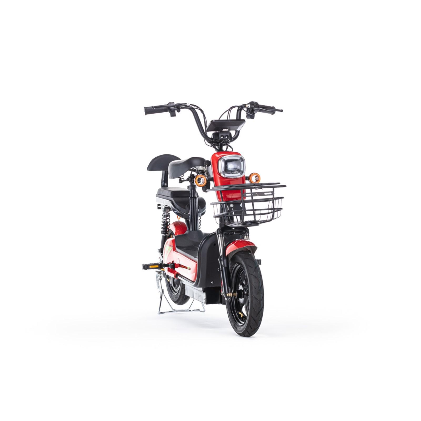 Велосипед имеет литые диски 14'' и развивает скорость до 35 км/час. Тормоза барабанные, спереди и сзади. Присутствует светодиодная фара и указатели поворотов. Можно ездить вдвоем, для заднего пассажира есть специальная подножка. Рама выполнена из высокоуглеродистой стали. Электровелосипед прекрасно подходит для прогулок в городе и за городом, поездок на даче, в парках. Соблюдайте правила дорожного движения и используйте необходимую экипировку. Катайтесь с удовольствием!