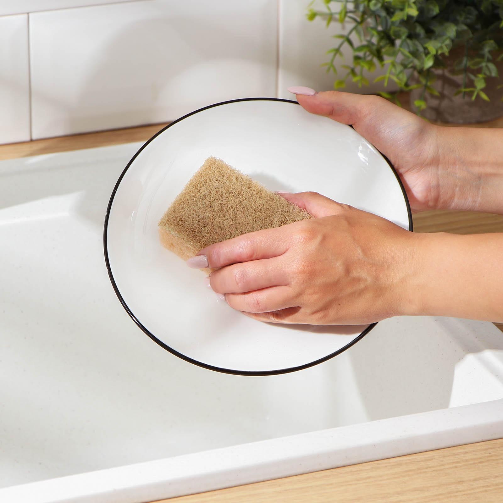 Губки выполнены из крупнопористого поролона, что обеспечивает обильное пенообразование. Благодаря структуре изделия остатки еды и жир легко вымываются Абразивный слой изготовлен из натурального материала – сизали. С его помощью вы без труда отчистите даже сильные загрязнения.