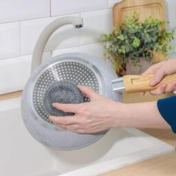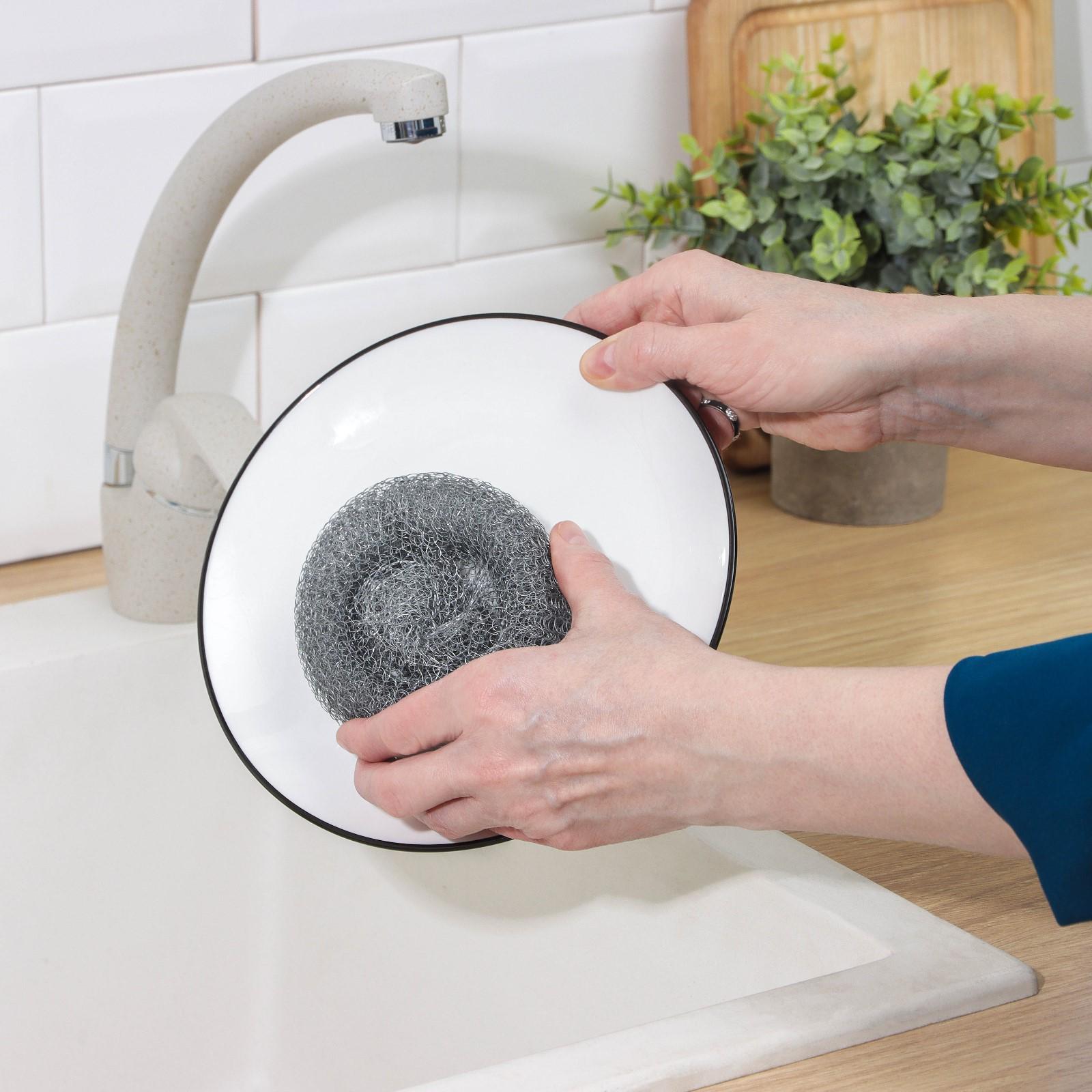 Металлические губки для мытья посуды без труда справятся с чисткой сильных загрязнений. Также губка предназначена для мытья посуды, чистки раковин и других сильно загрязненных поверхностей. Легко удаляет сажу, пригар, копоть.