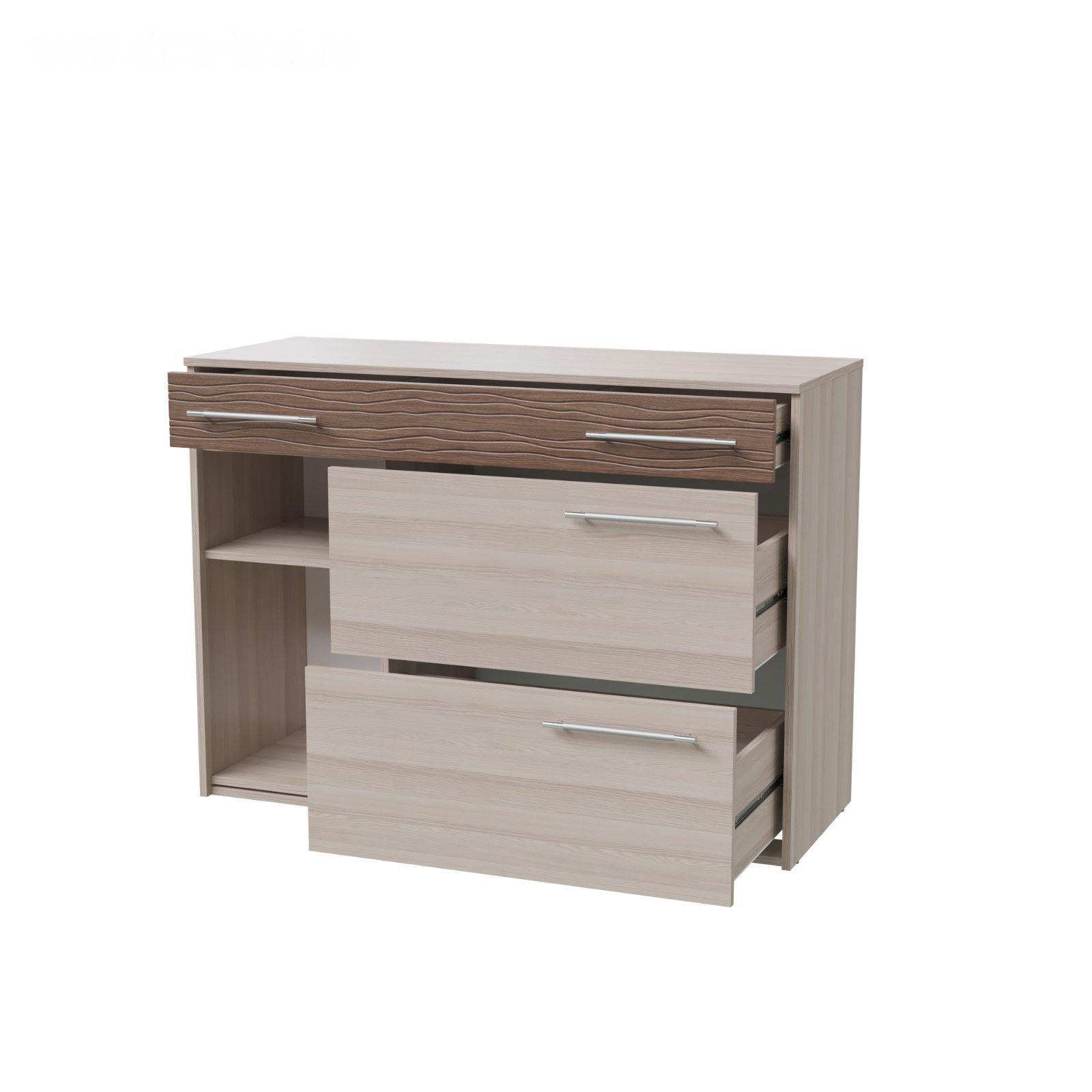 Данная модель компактна и даже визуально не загромождает пространство. Вы сможете вместить в неё большое количество вещей. Ящики, закреплённые на роликовых направляющих, выдвигаются полностью и плавно.