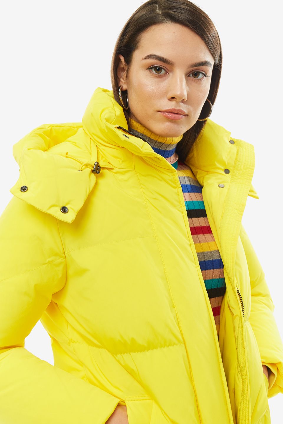 - Состав ткани 91% полиамид, 9% эластан, подкладка — 100% полиамид, наполнитель — 90% утиный пух, 10% перо