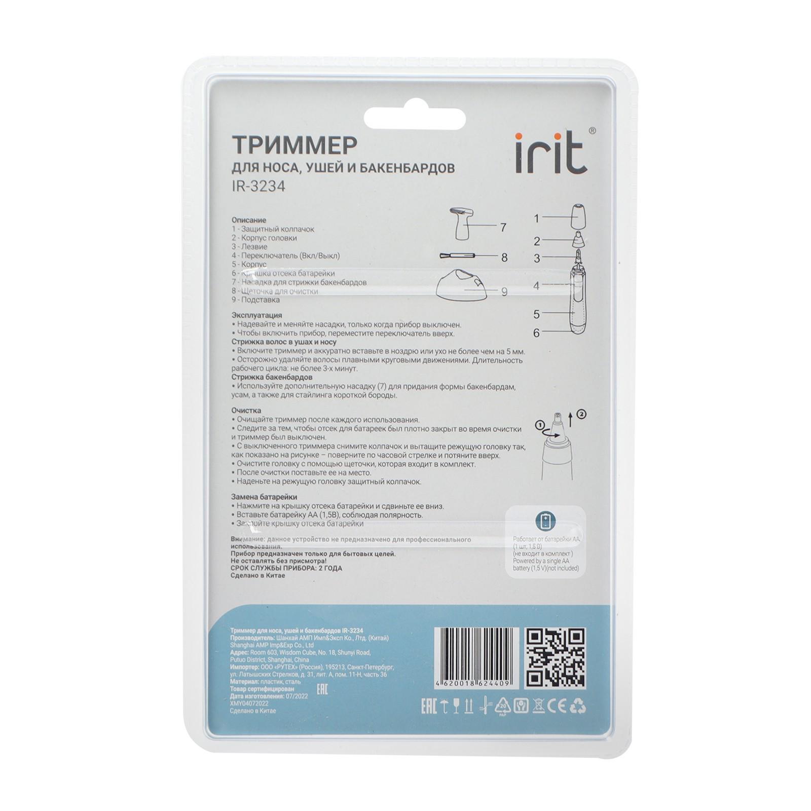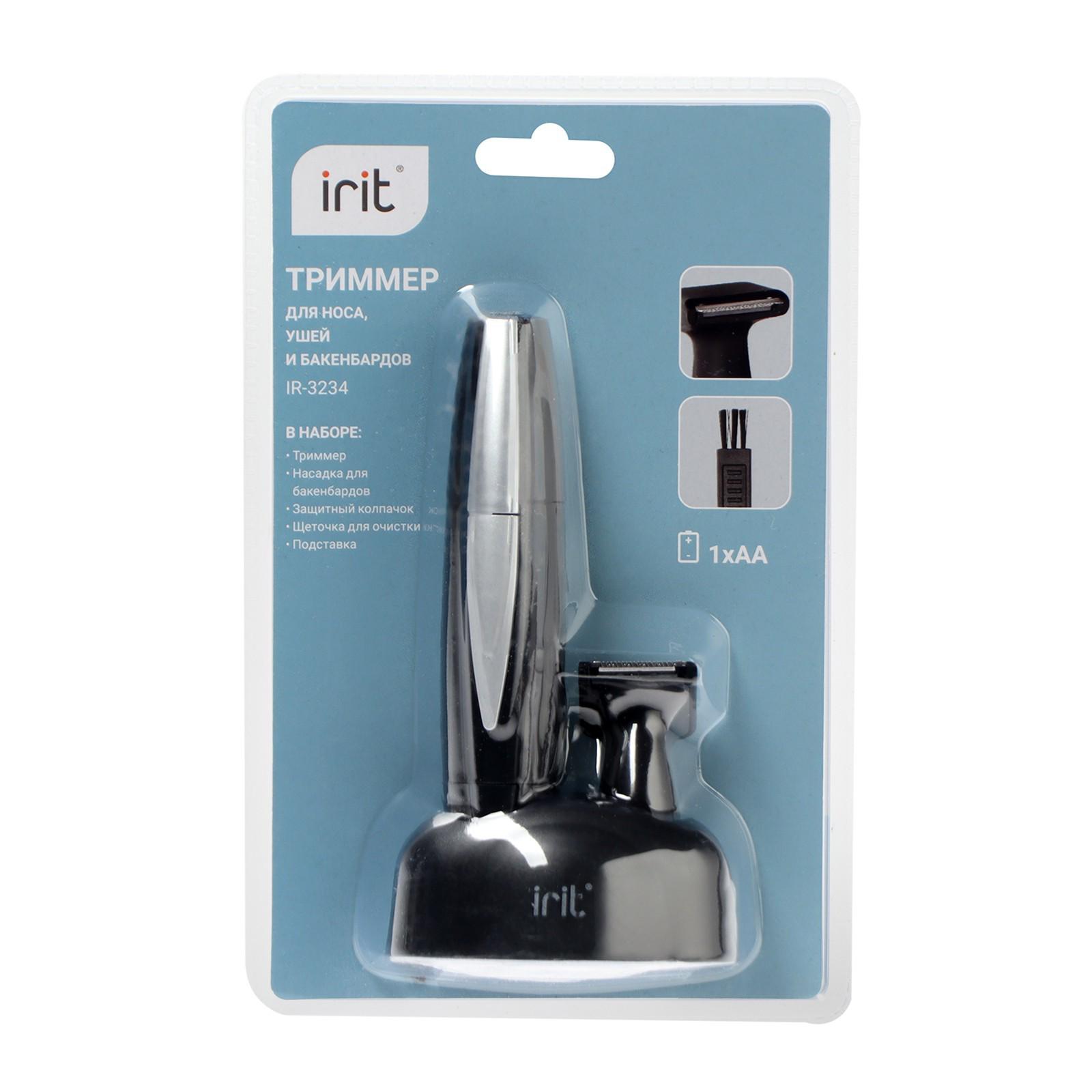 Триммер Irit IR-3234, 1.5 Вт, для носа, ушей и бакенбардов, 2 насадки, щёточка