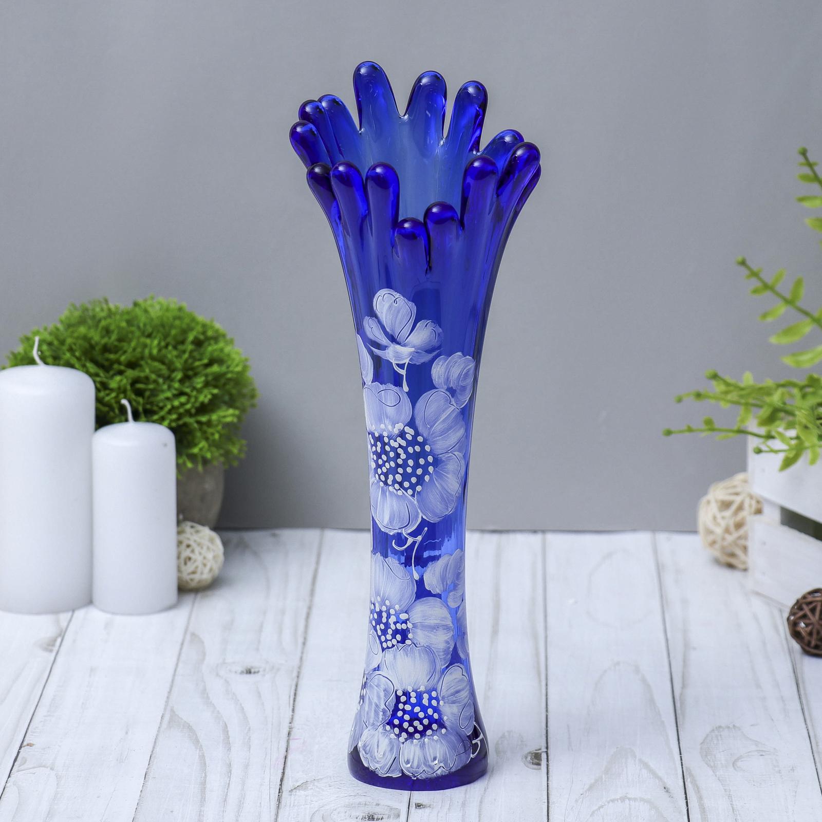 Ваза "Коралл" h 280 мм. из синего стекла (ручная роспись) рис. № 9 (Бел.)