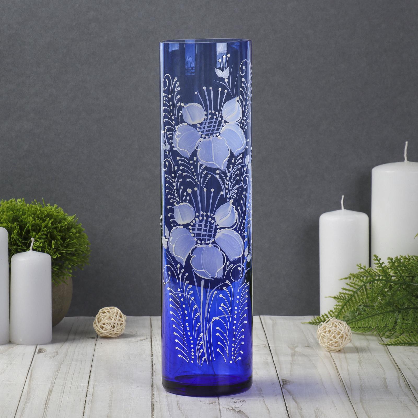 Ваза "Цилиндр" d 80*h 300 мм. из синего стекла (ручная роспись) рис. № 7 (Бел.) преобразит пространство и как самостоятельный элемент декора. Наполните интерьер уютом!