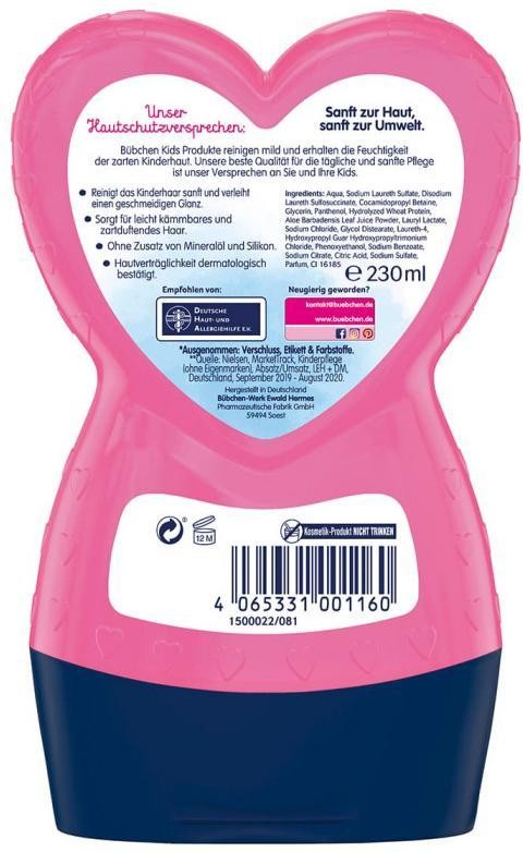 Шампунь 2 в 1 для справжніх юних принцес. Ніжний аромат і м'яка пінка перетворять процес купання і миття голови в справжню насолоду. Завдяки натуральним компонентам і оліям, що входять до складу шампуню, шкіра вашої дитини буде ніжною і бархатистою, а волосся м'яким, блискучим. Має нейтральний pH. При попаданні в очі не подразнює слизову. Волосся не плутається і легко розчісується. Bubchen в перекладі з німецької - «малюк», девіз компанії Bubchen: «Ніжний захист». І це не просто красиві слова. Виробники піклуються про здоров'я наших діток, тому використовують для виготовлення засобів для догляду за шкірою тільки натуральні компоненти, екстракти і витяжки з лікарських трав і тільки натуральні олії.