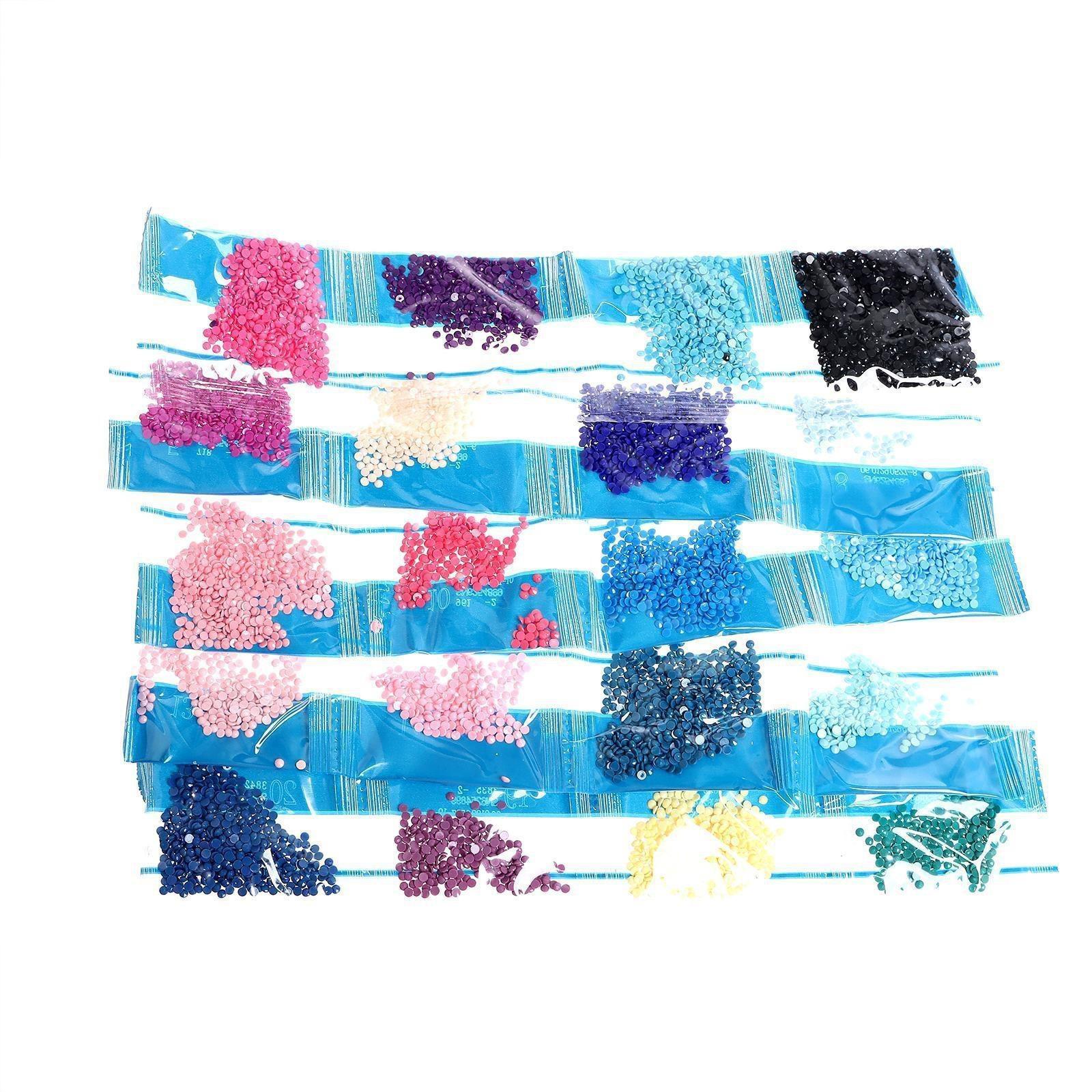Разложите кристаллики с помощью карандаша по указанной схеме, заполнив полотно. Тканевая основа с точечным клеевым покрытием будет надёжно удерживать стразы. На картине уже обозначены необходимые оттенки.