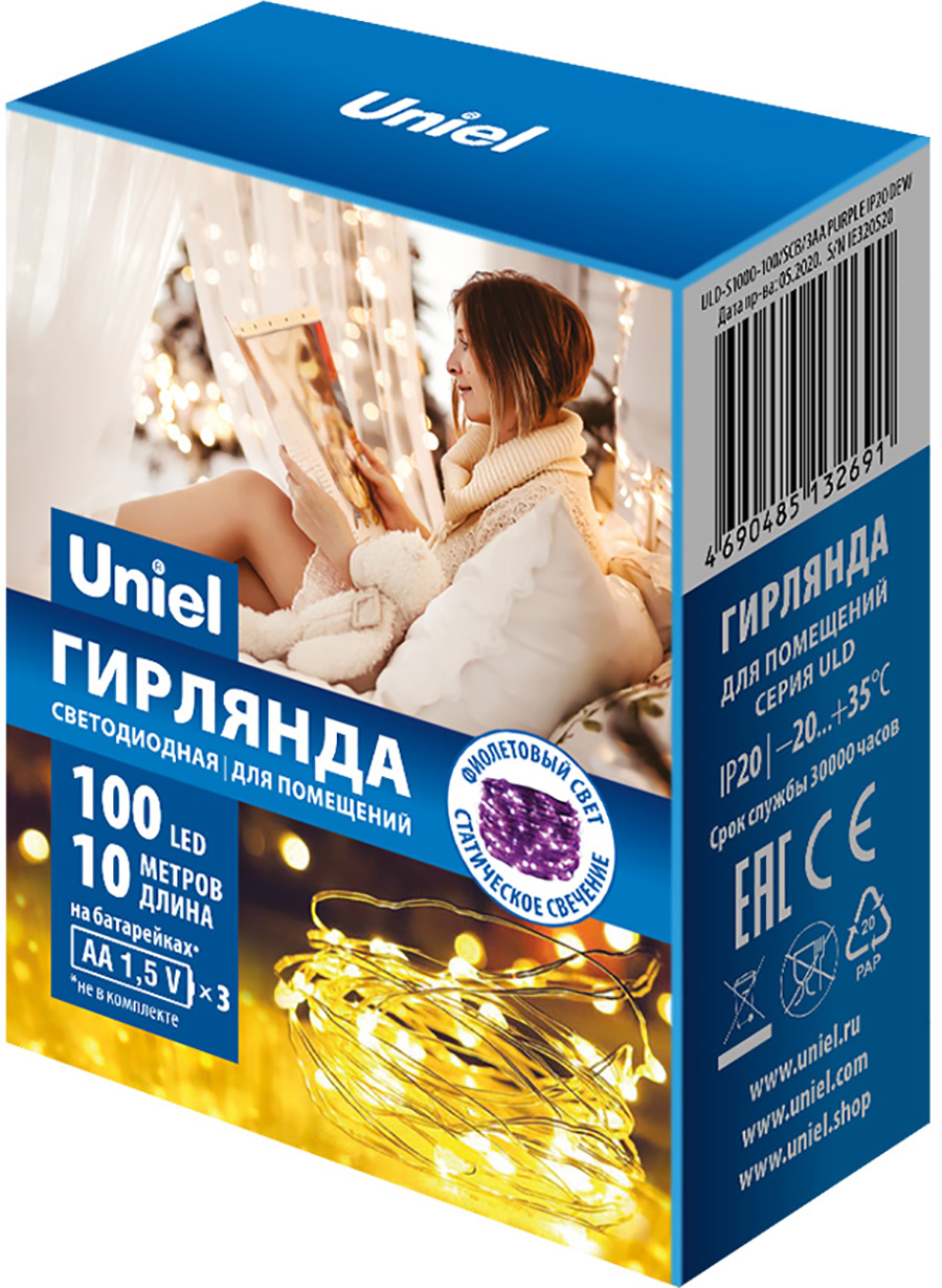 Гирлянда cветодиодная Uniel ULD-S1000-100/SCB/3AA Purple IP20 Dew