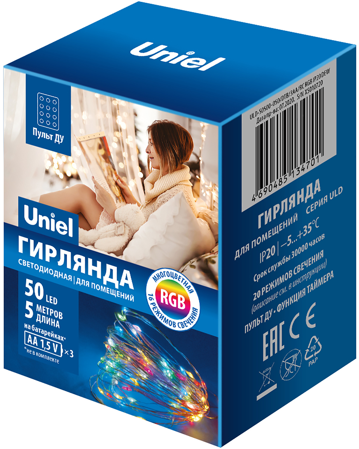 Гирлянда cветодиодная Uniel ULD-S0500-050/DTB/3AA/RC RGB IP20 Dew