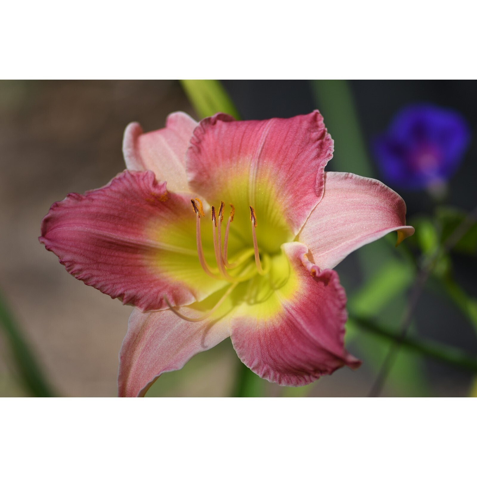 Нежный розово-пурпурный цветок с желто-зеленым стаканом. Края лепестков волнистые.
