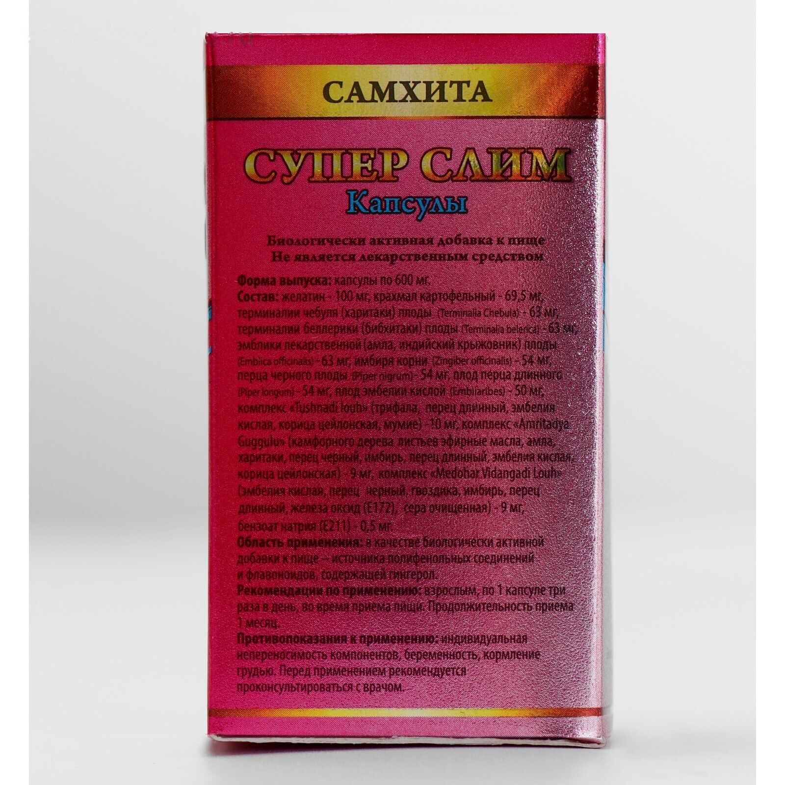 Состав: Терминалии чебуля (харитаки) плоды, термналии беллерики (бибхитаки) плоды, эмблики лекарственной (амлы, индийского крыжовника) плоды, имбиря корни, перца черного плоды, плод перца длинного, плод эмбелии кислой, комплекс"Tushnadi louh" (трифала, перец длинный, эмбелия кислая, корица цейлонская, мумие), комплекс "Amritadya Guggula" (камфорного дерева листьев эфирные масла, амла, харитаки, перец черный, имбирь, перец длинный, эмбелия кислая, корица цейлонская), комплекс "Medohar Vidangadi louh" (эмбелия кислая, перец черный, гвоздика, имбирь, перец длинный, Е172, сера очищенная), крахмал картофельный, Е211, желатин (оболочка капсулы).