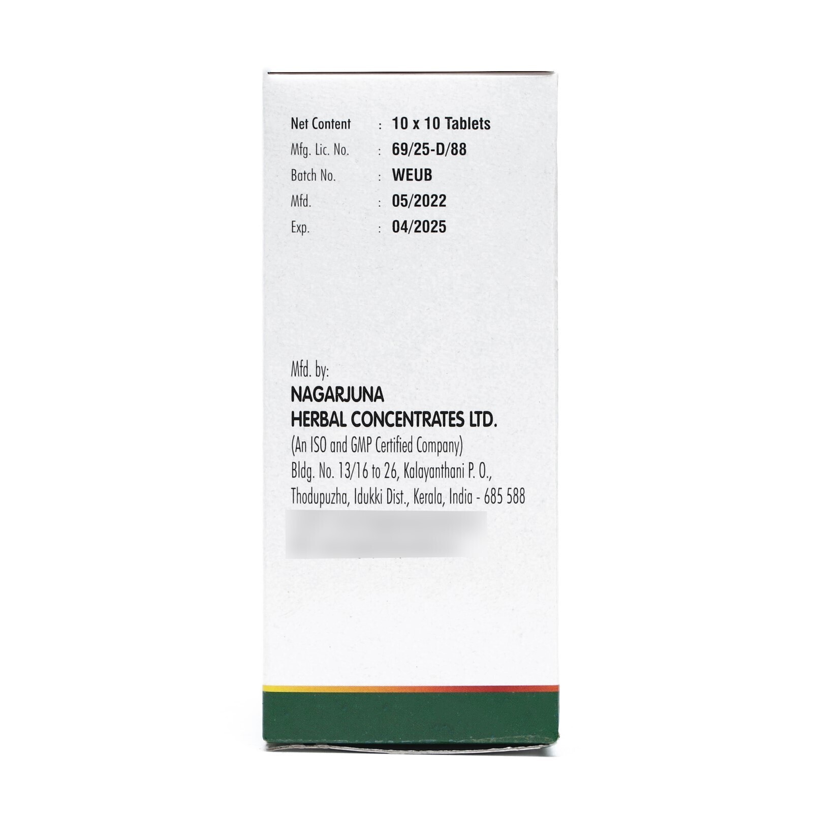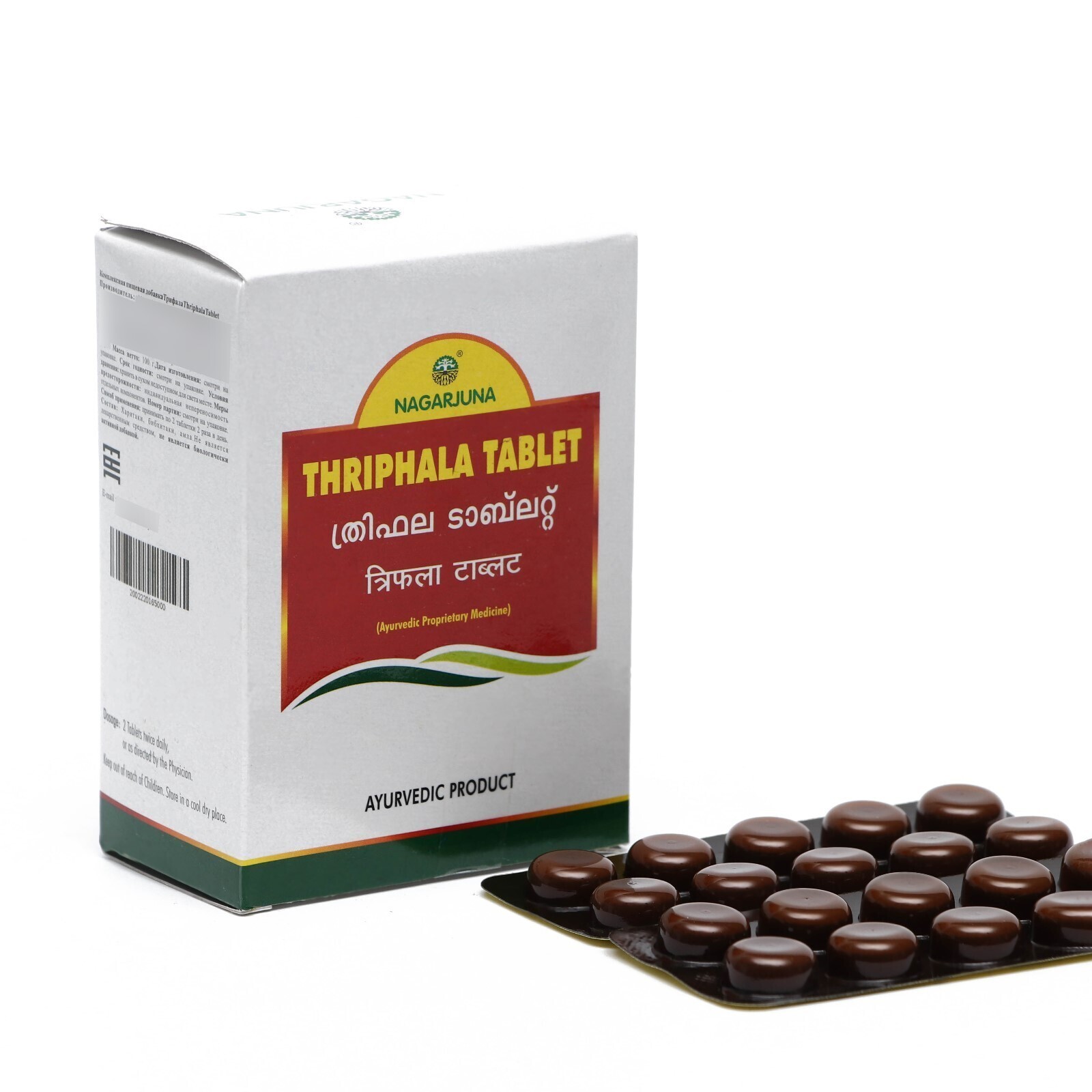 Трипхала в таблетках Nagarjuna представляет собой однородный прессованый в таблетки порошок серовато-зеленовато-коричневого цвета с приятным запахом сушёных фруктов, нерастворимый в воде. Цвет может варьировать в достаточно широких пределах, но в идеале он светлый. Вкус слегка вяжущий и пряный, наибольшего проявления достигающий при применении препарата с молоком.