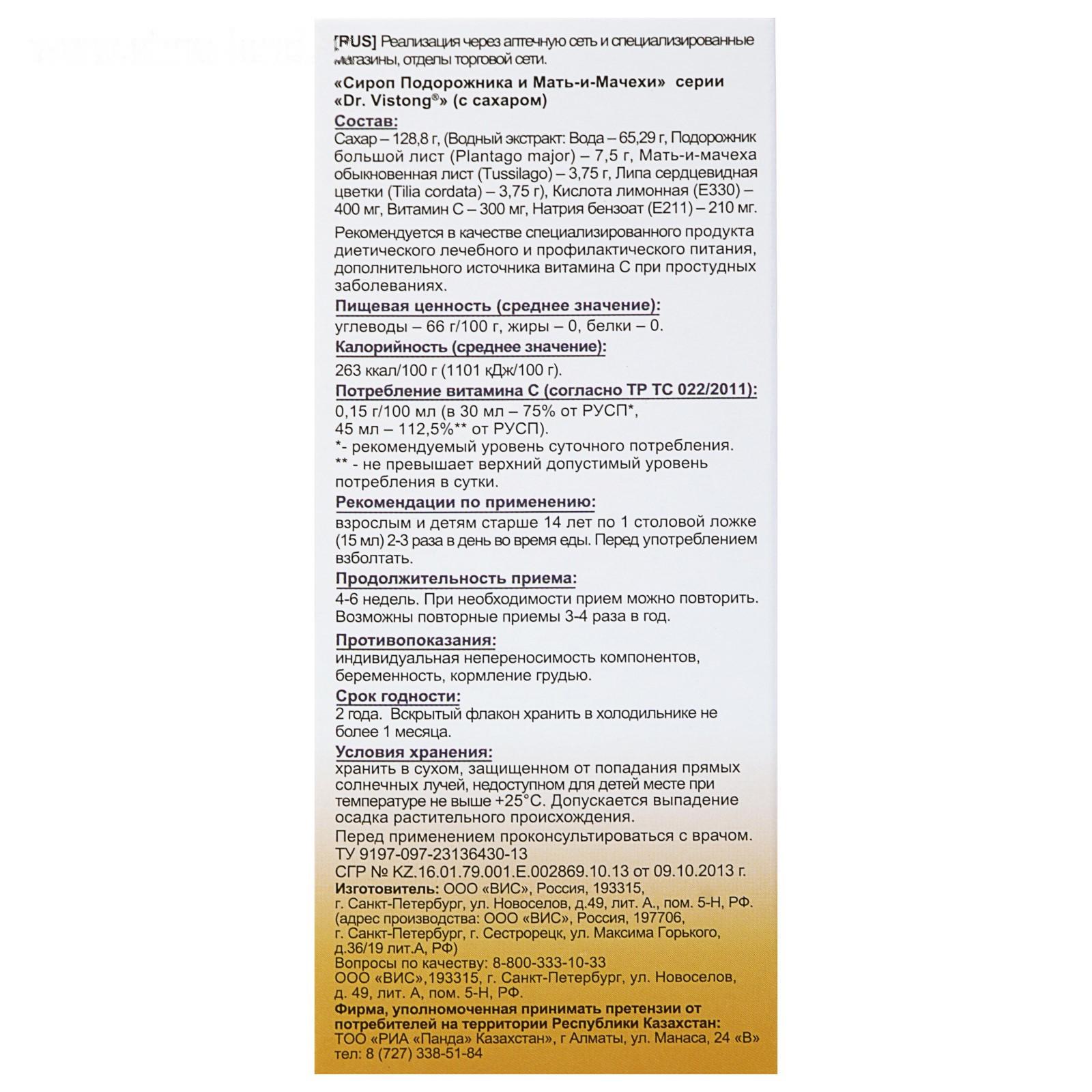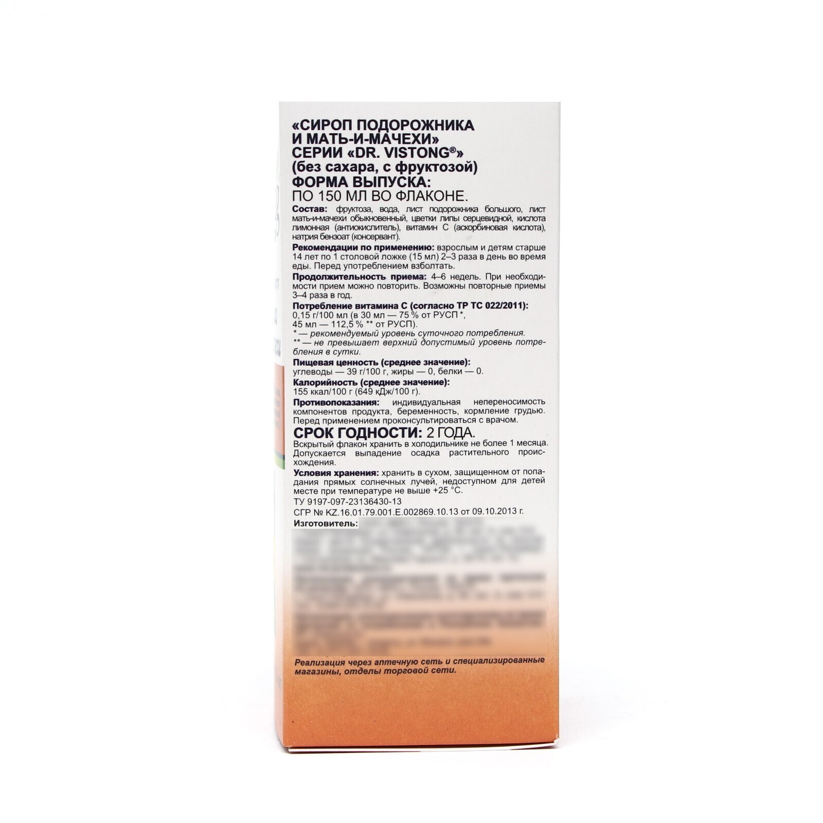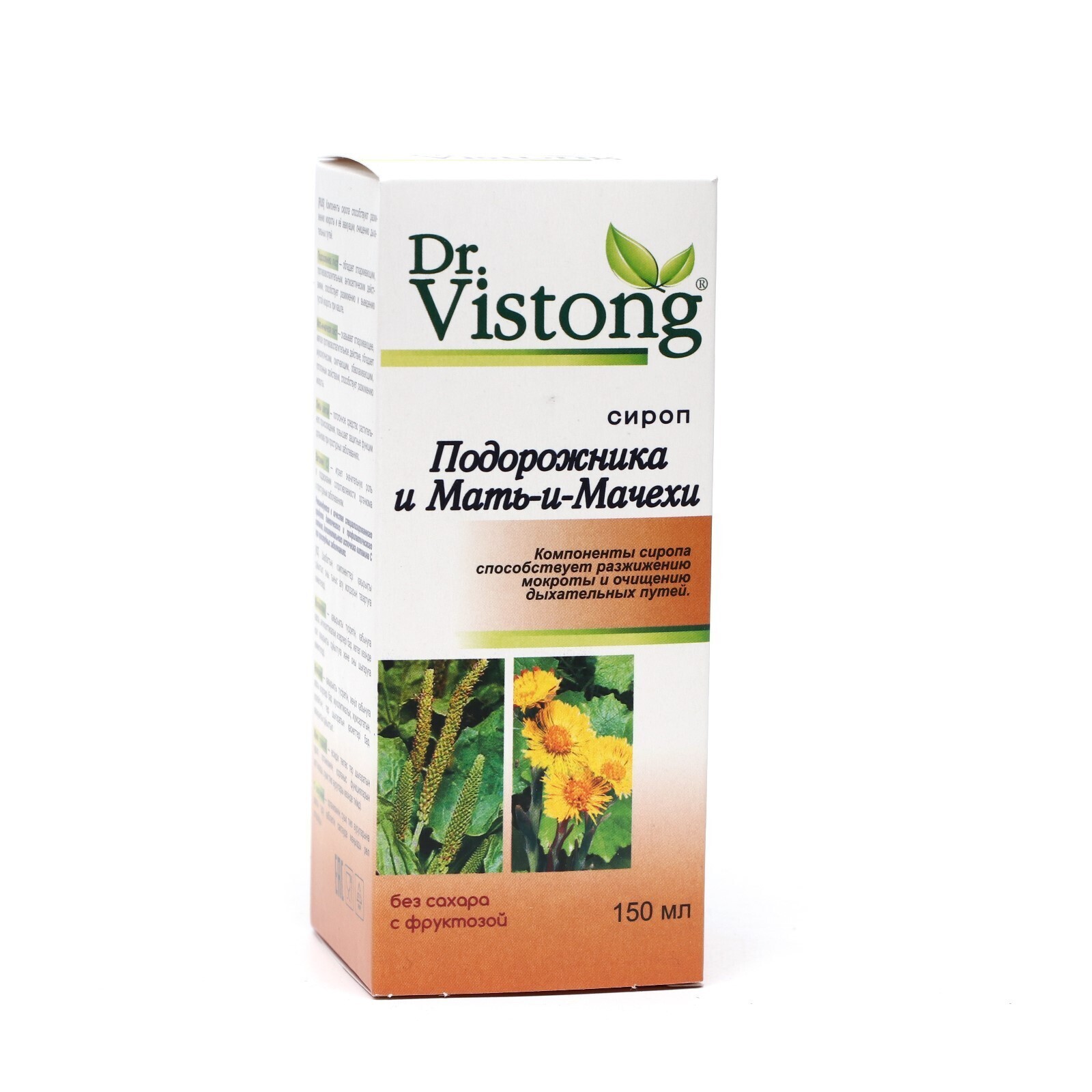 Сироп Подорожника и Мать-и-Мачехи серии "Dr. Vistong(R)" — это растительный комплекс, компоненты которого обладают противовоспалительным, муколитическим, мягким отхаркивающим и обволакивающим действиями, способствуют разжижению, выведению мокроты, восстановлению и заживлению слизистой оболочки верхних дыхательных путей. Цветки липы и витамин С повышают защитные функции организма.