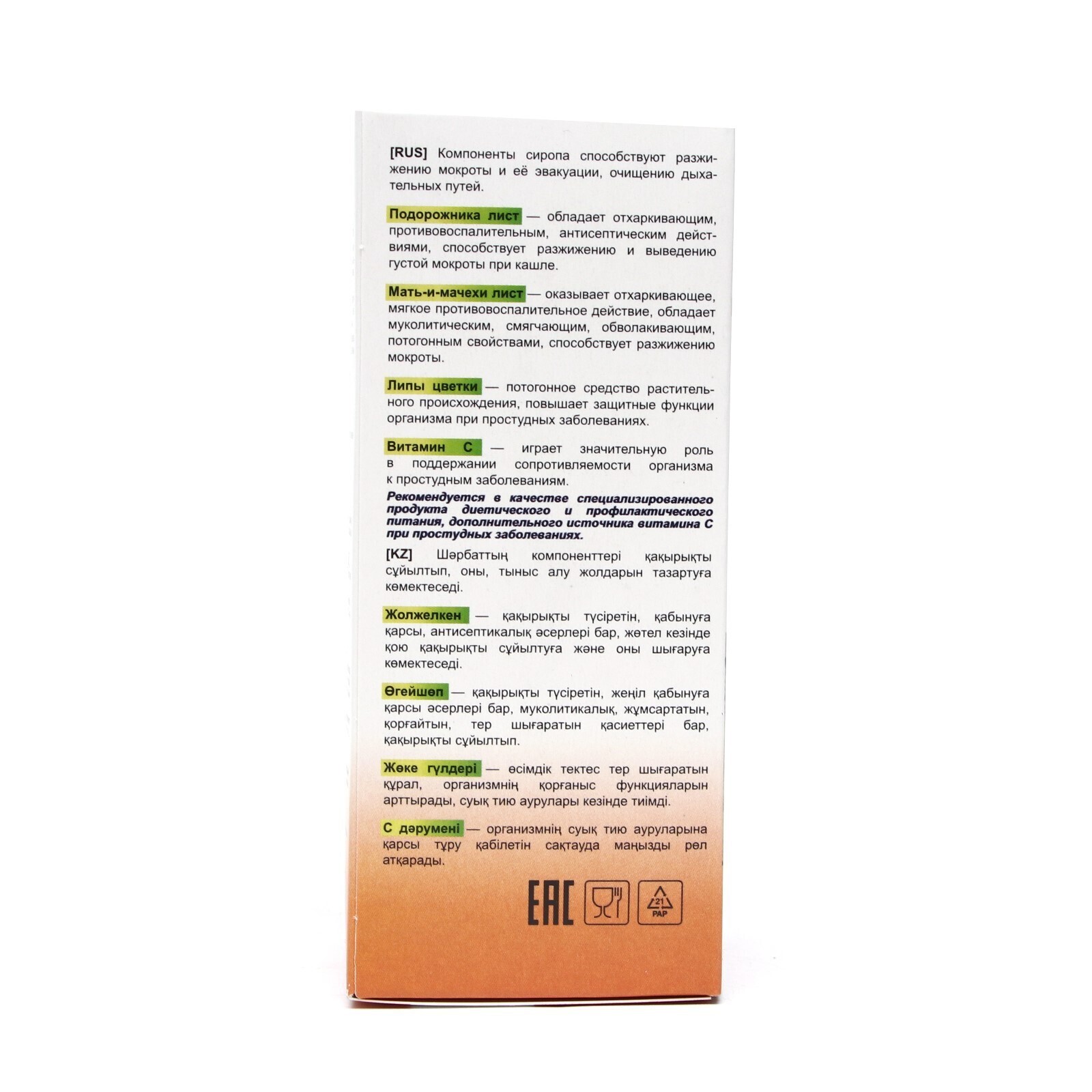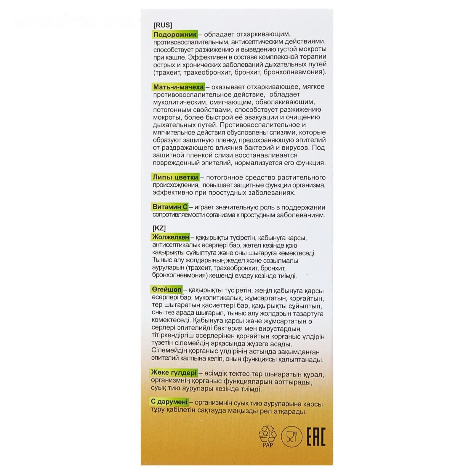 Состав: подорожник большой лист (Р1ападо глаог) - 7,5г, мать-и-мачеха обыкновенная лист (Tussilago) - 3,75г, липа сердцевидная цветки (Ti1ia cordata) - 3,75г), кислота лимонная (Е330) - 400мг, витамин С - 300мг, натрия бензоат (Е211) -210мг, сахар - 128,8г, (Водный экстракт: Вода - 65,29г).