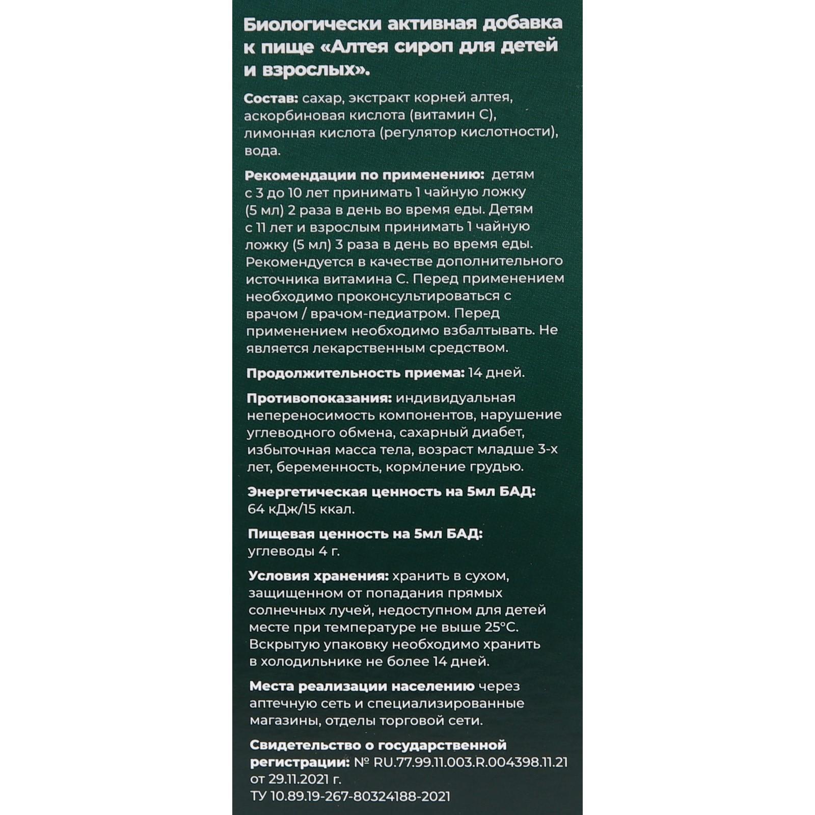 Состав: сахарный сироп,настой растительного сырья: корень алтея лекарственного, сосновые почки, лист мать-и-мачехи, кедровый орех, аскорбиновая кислота, сорбат калия, лимонная кислота.