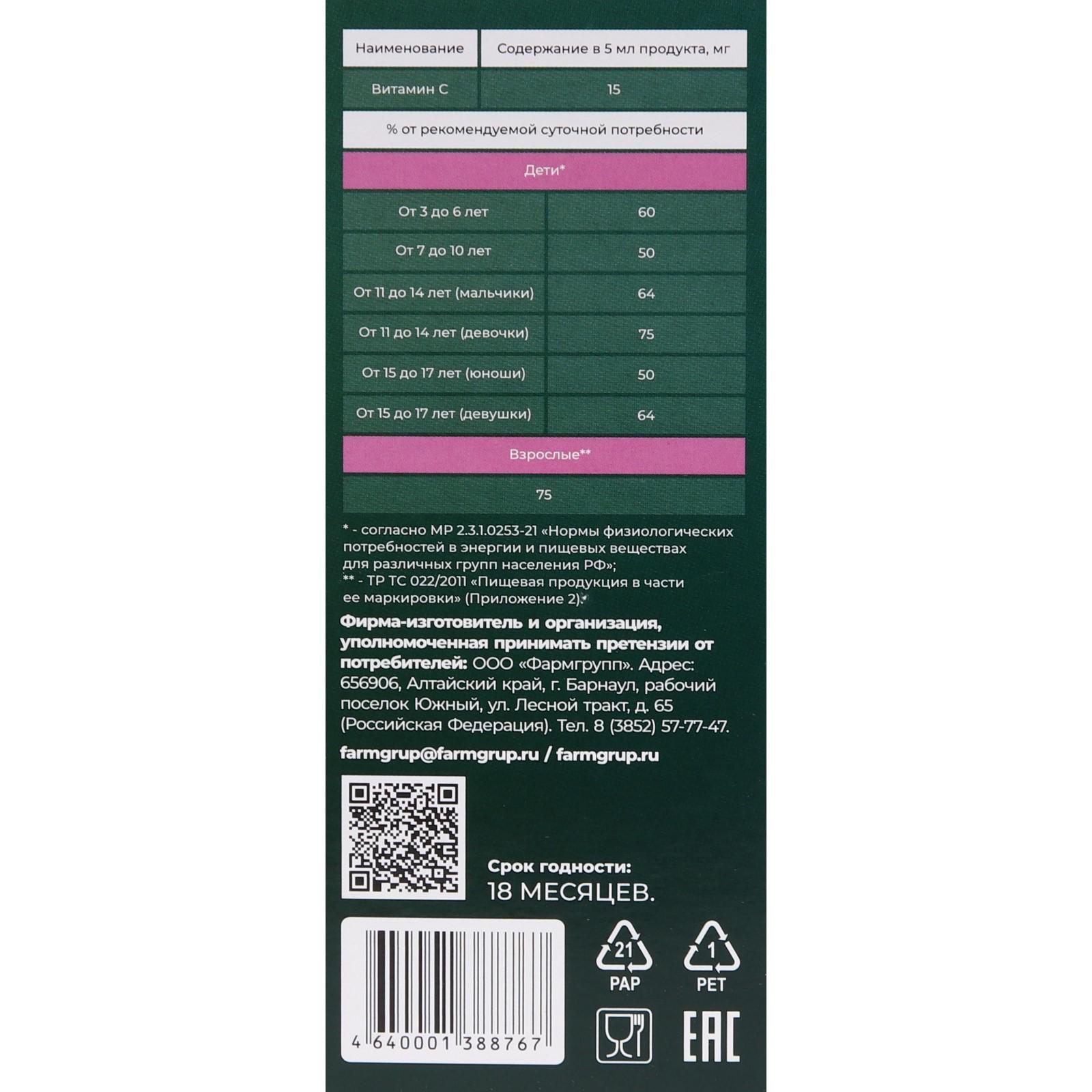 Витамин С - Мощный антиоксидант, способствует укреплению иммунитета, усиливает защитные, антибактериальные свойства компонентов сиропа.