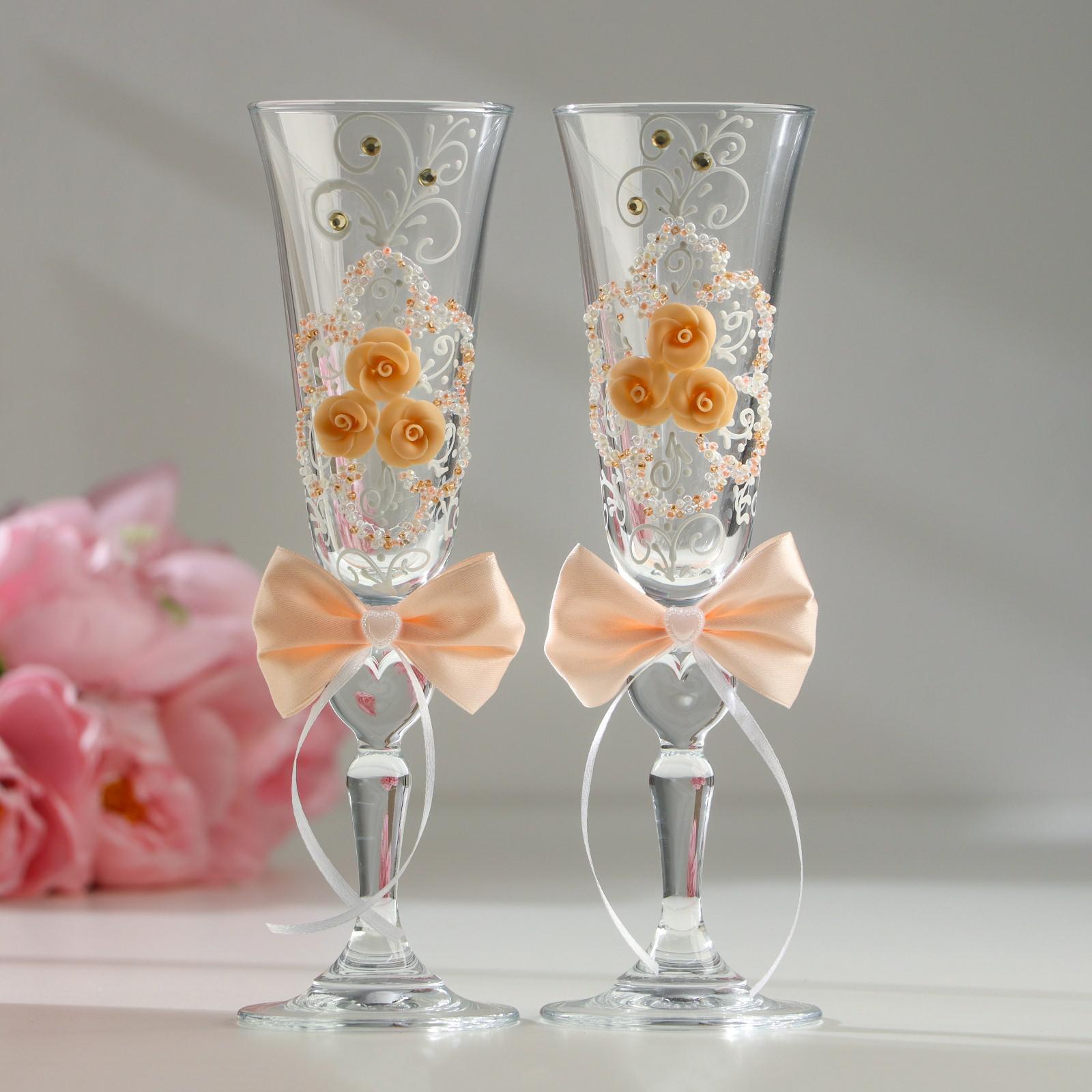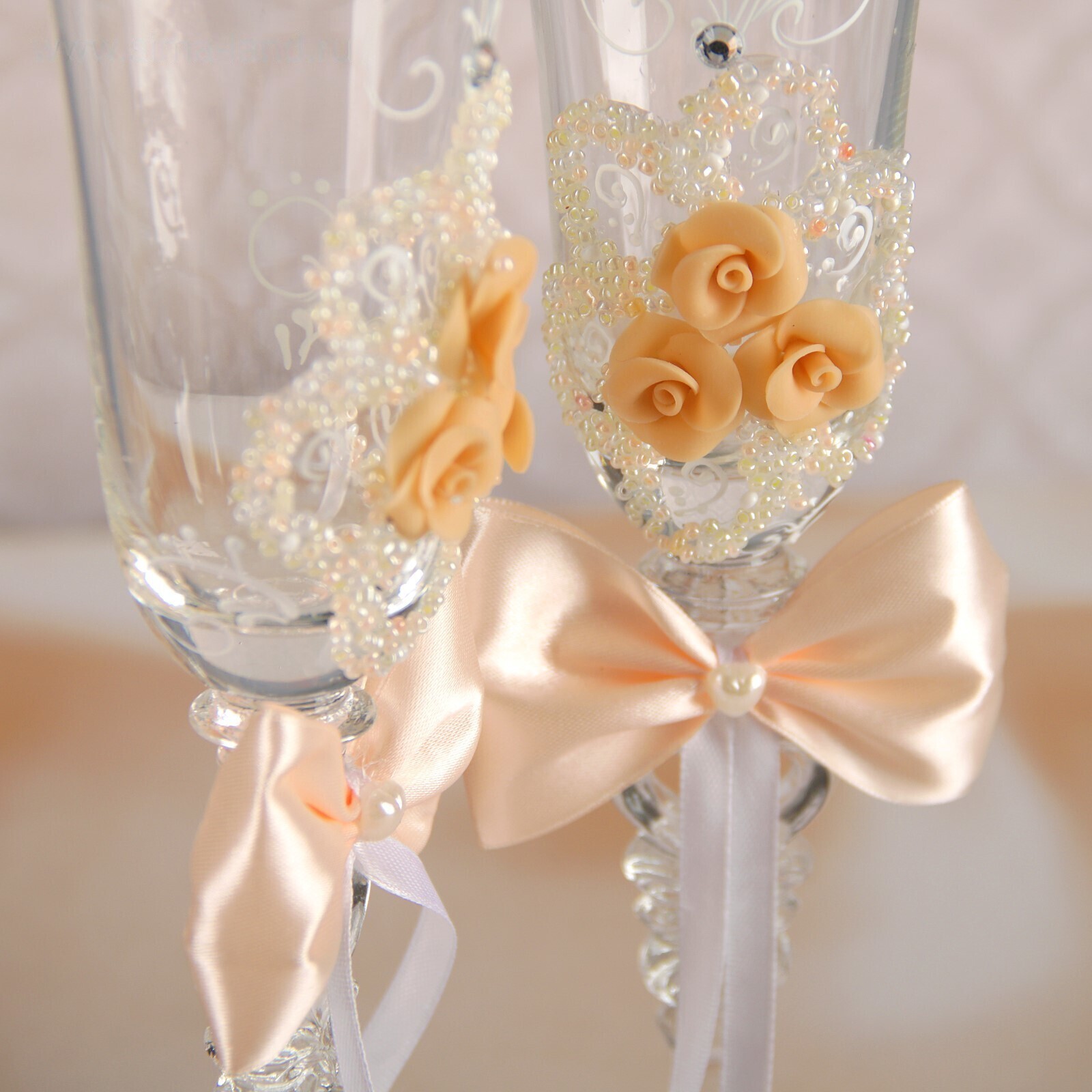 Набор свадебных бокалов "Восторг", с лепниной, бисером и бантами, персиковый
