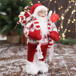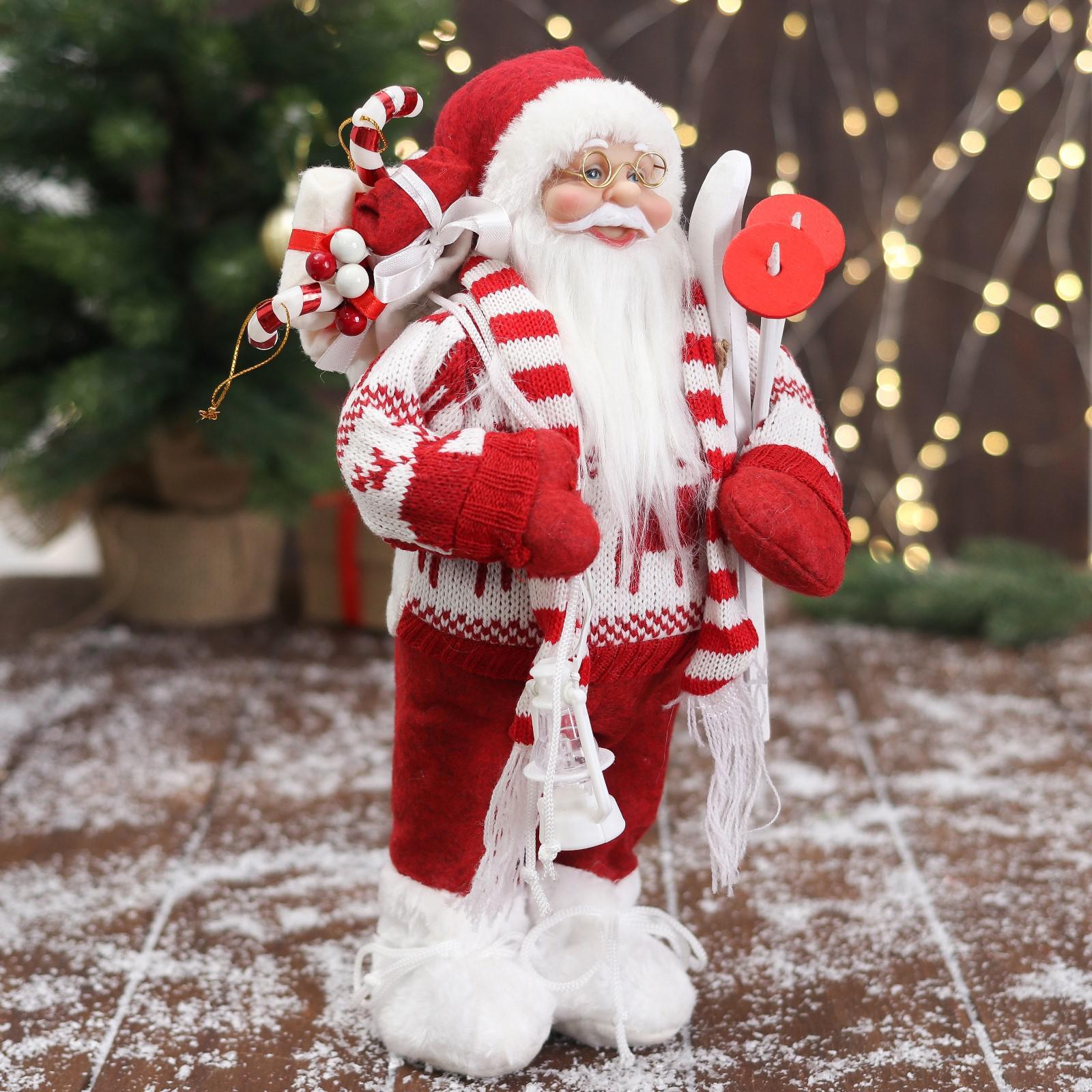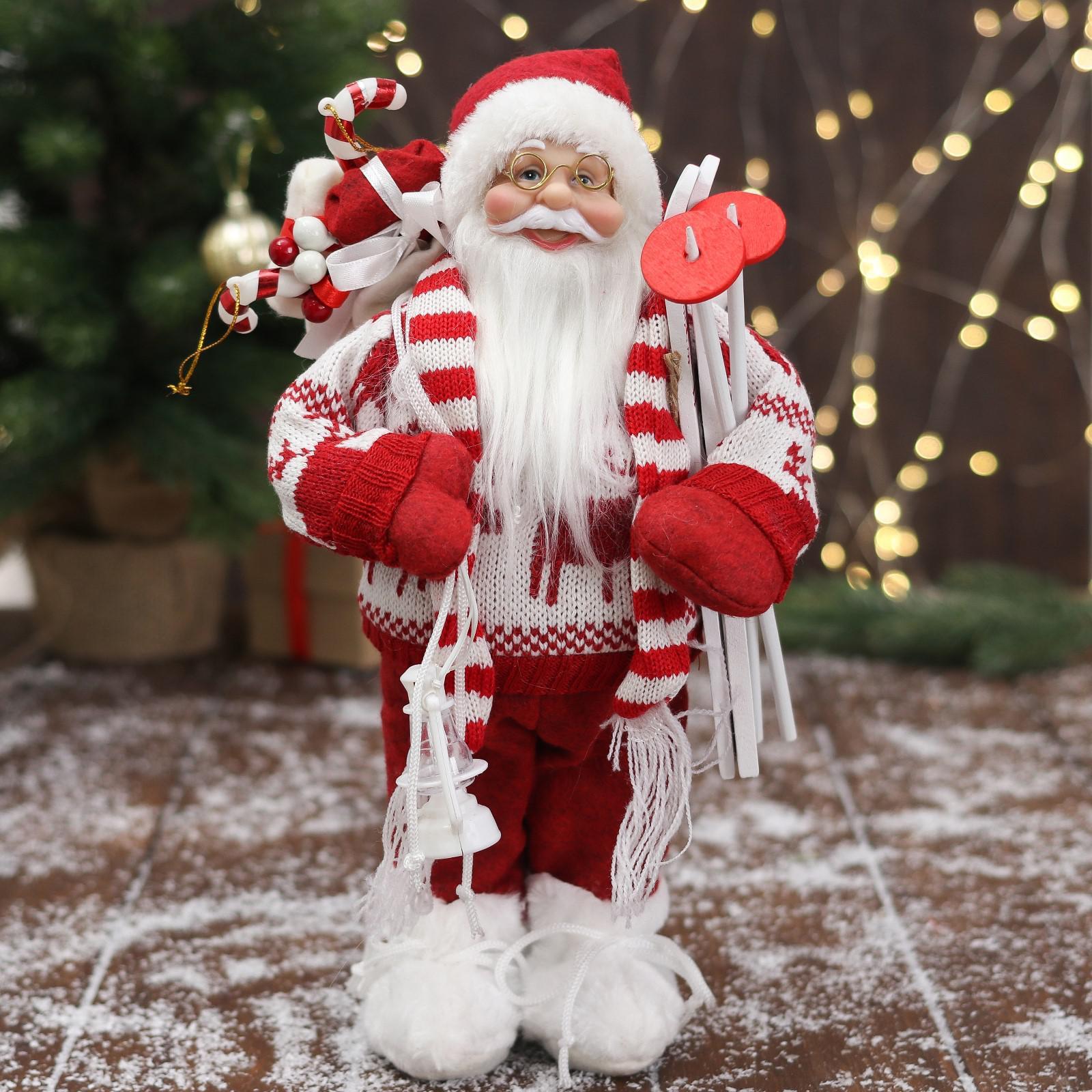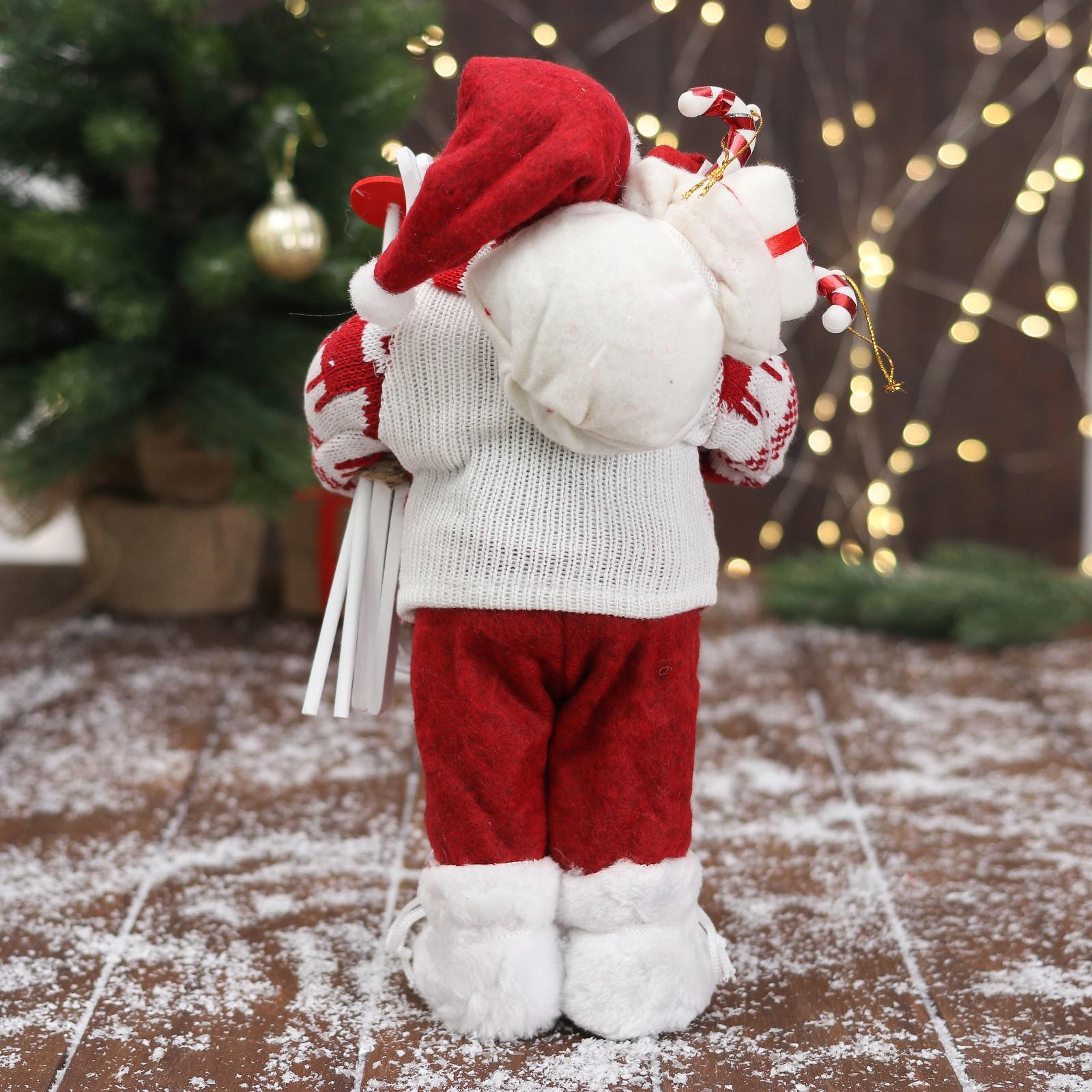 Дед Мороз "В вязаном костюме, с лыжами и мешком" 30 см