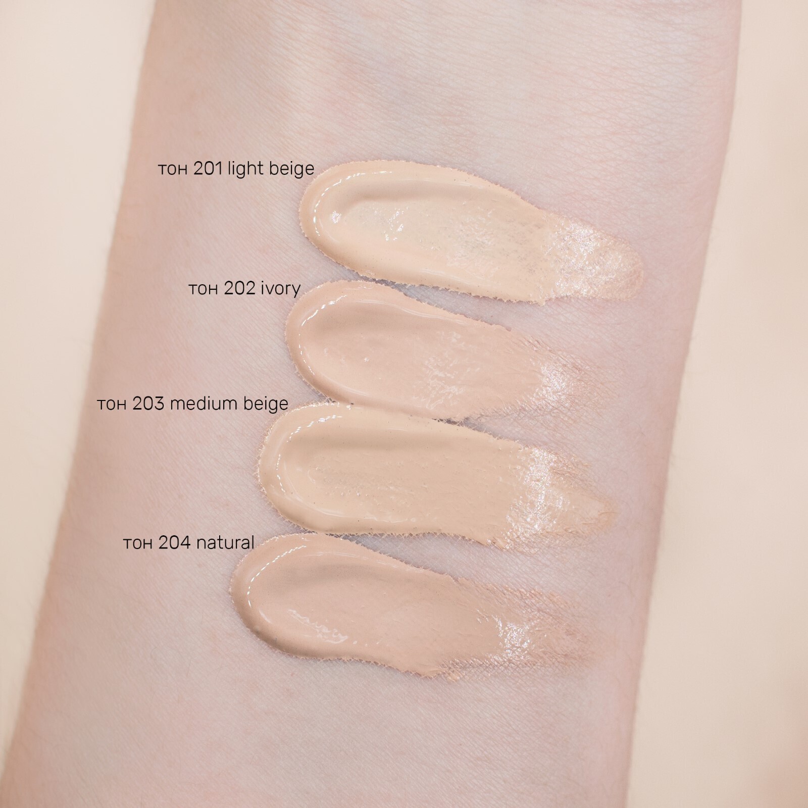 Тональный крем действует в совершенной гармонии с кожей. Обладает стойким покрытием средней плотности, естественным образом разглаживает текстуру кожи, скрывает несовершенства и делает тон лица идеально ровным, оставляя бархатистый финиш на весь день. Одновременно с созданием совершенного внешнего вида продукт адаптируется под любой тип кожи, матирует Т-зону и увлажняет другие части лица, позволяя достичь уникального эффекта «второй кожи». Входящий в состав Бетаин и Витамин Е стимулируют выработку коллагена и поддерживают необходимый уровень влаги, благодаря которым кожа становится эластичной и шелковистой. УФ-фильтр защищает от вредного воздействия солнечных лучей. Без отдушек.