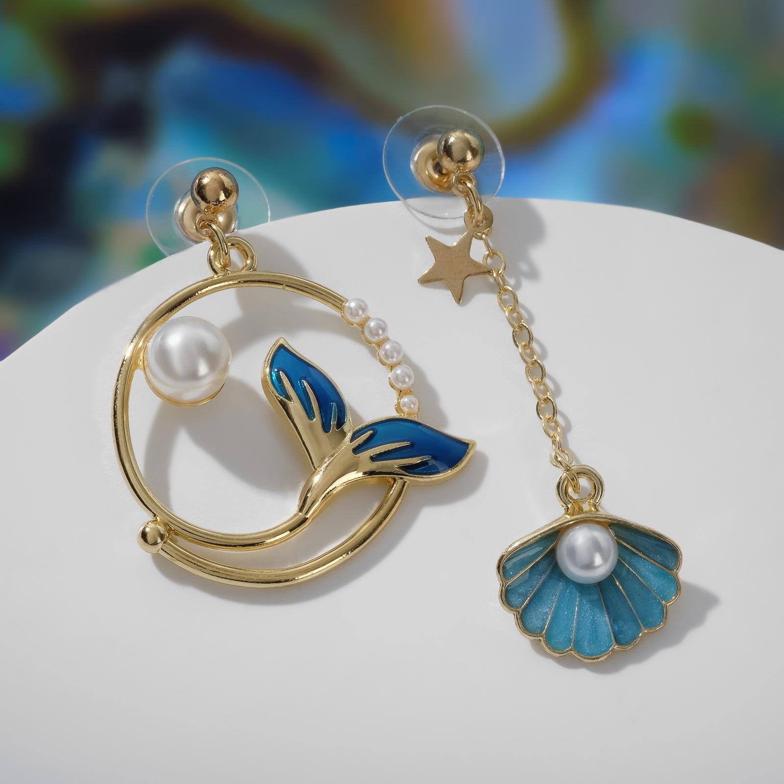 Серьги эмаль "Ночь" хвост с ракушкой, цвет сине-белый в золоте