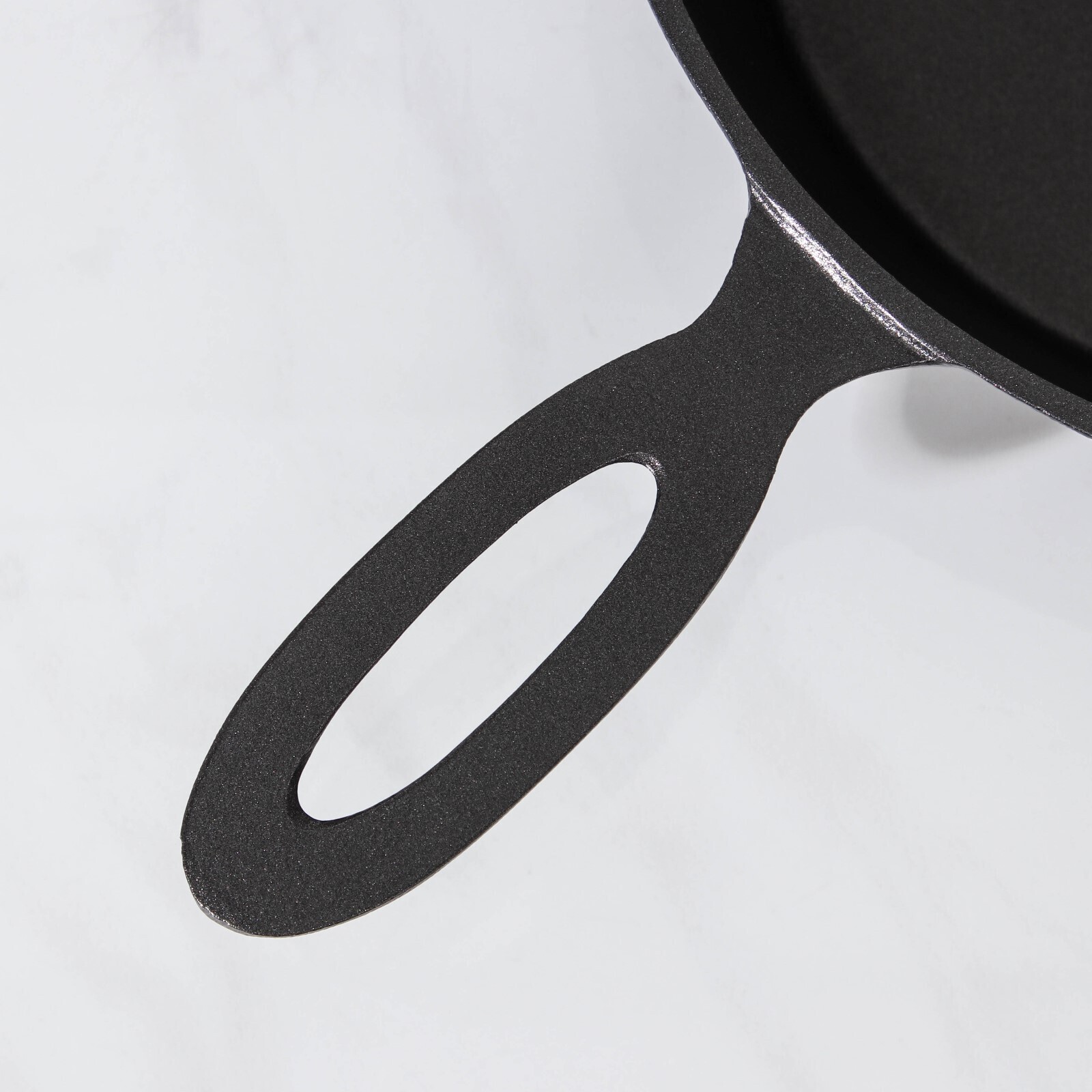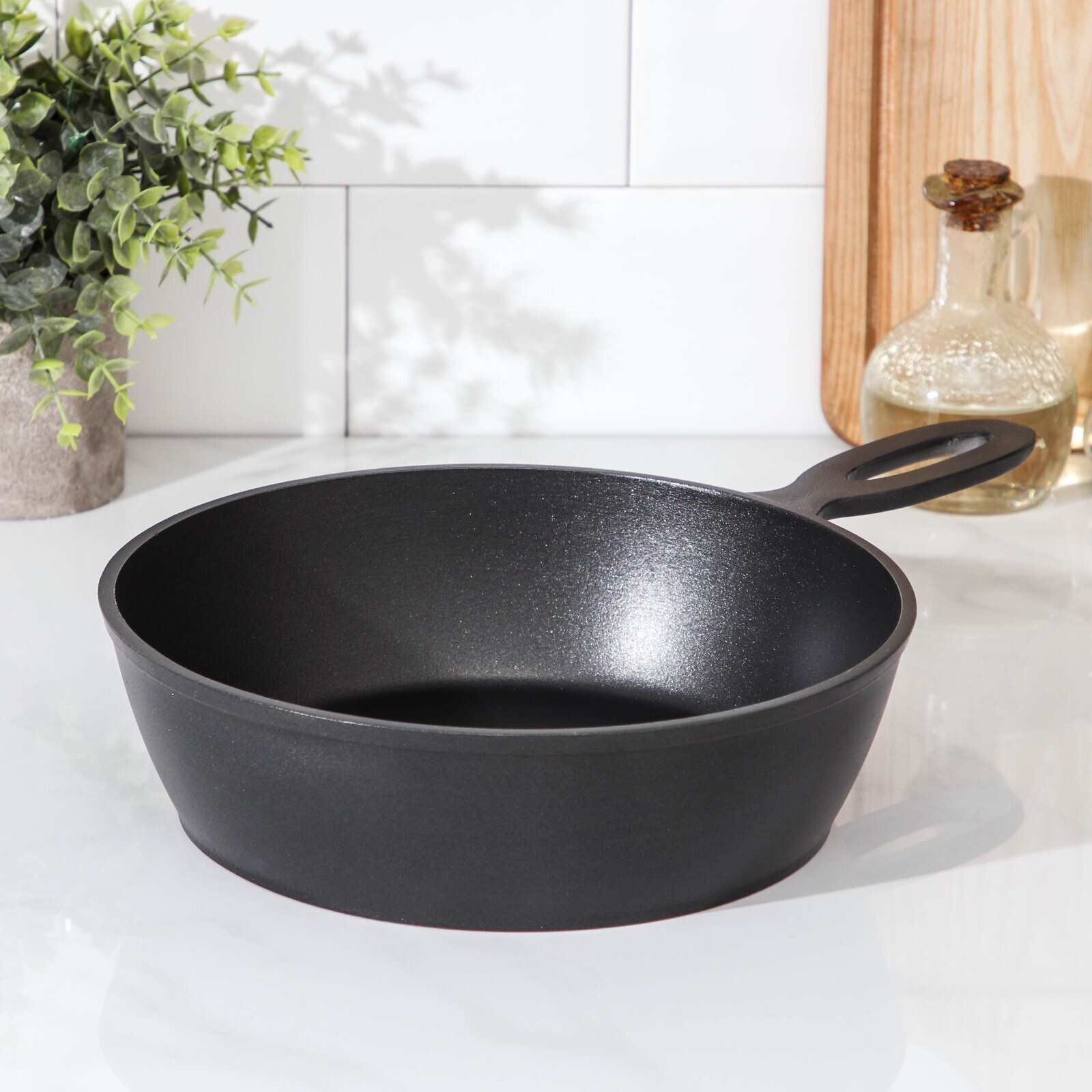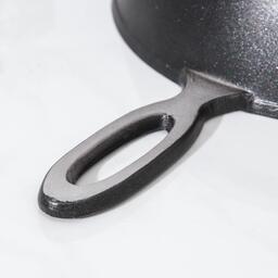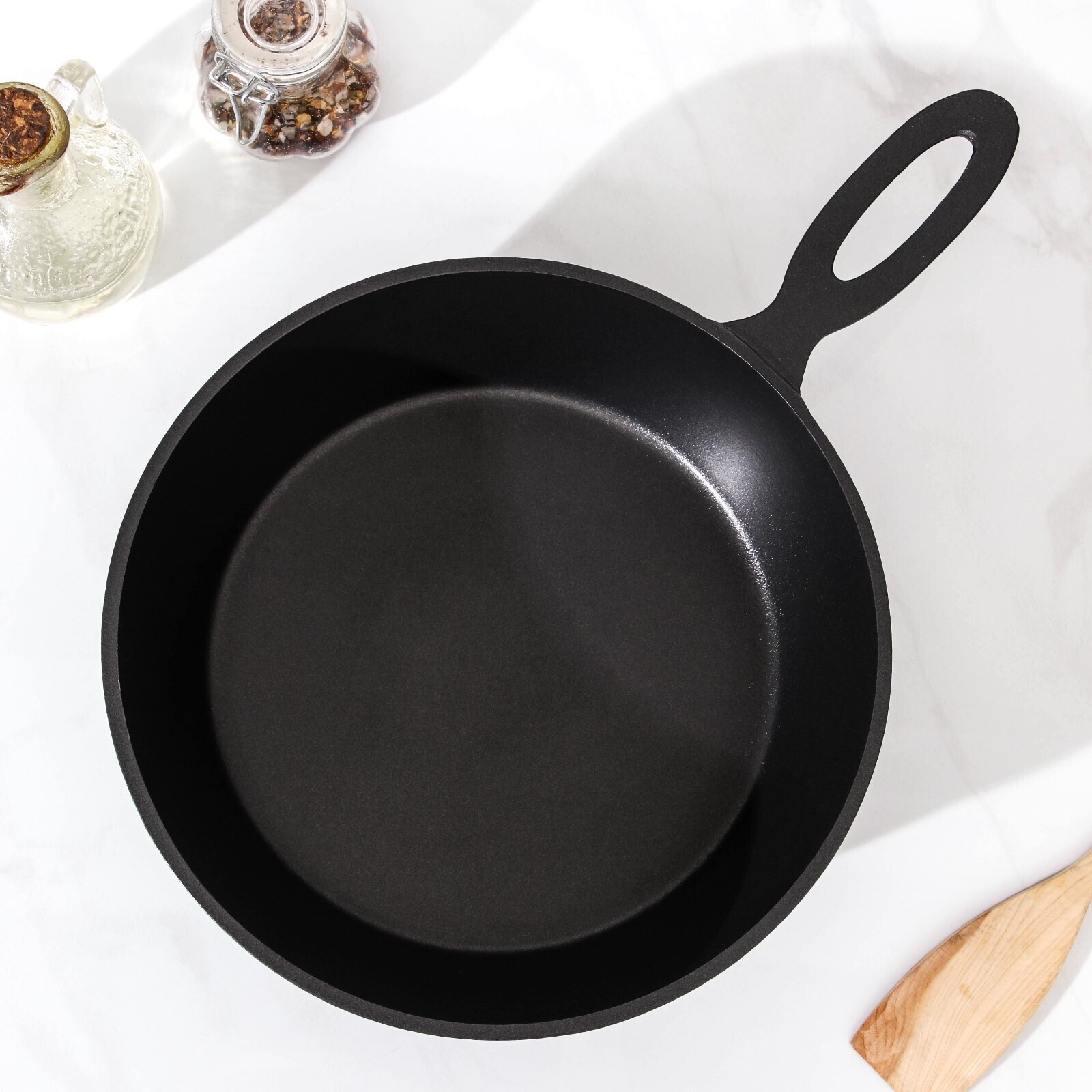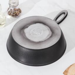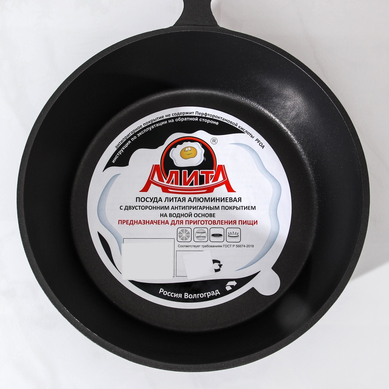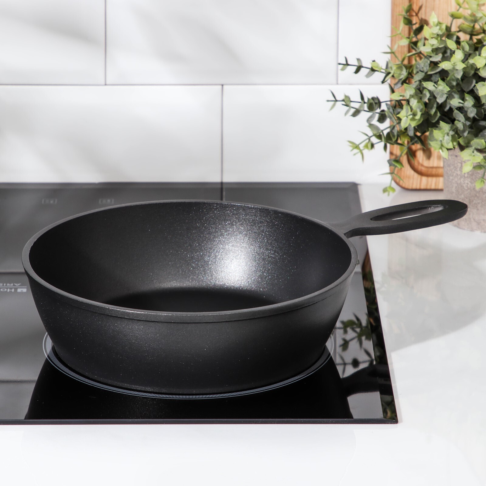 Сковорода из литого алюминия с высоким бортом удобна для повседневной готовки. В ней можно жарить мясо, овощи и рыбу, готовить соусы, разогревать полуфабрикаты. Благодаря быстрому распределению тепла это не займёт много времени.