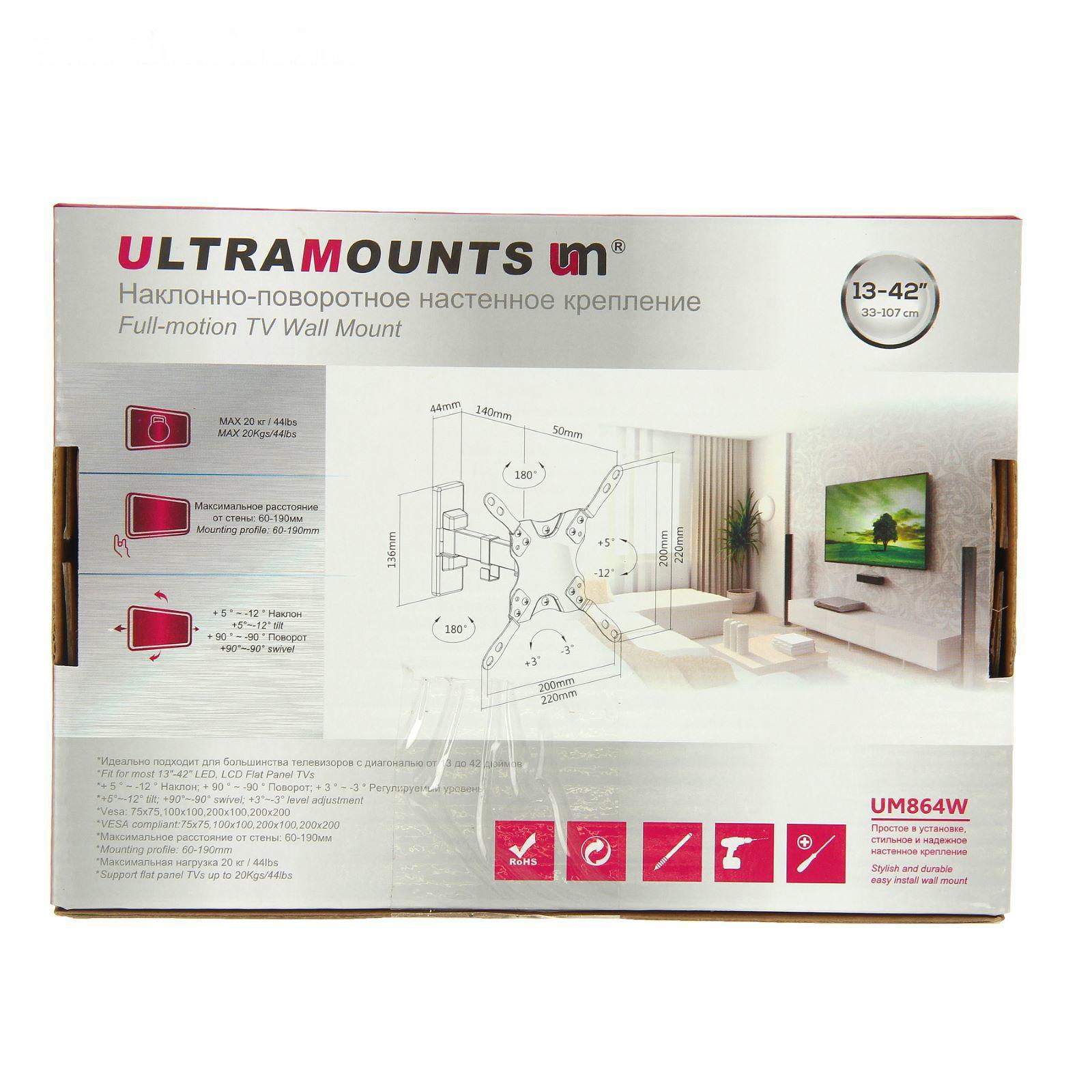 Кронштейн Ultramounts UM864W поможет сэкономить пространство и позволит разместить телевизор или монитор на стене. Конструкция рассчитана на приборы с диагональю экрана от 13 до 42 дюймов и выдерживает вес до 20 кг. Компактное и надёжное приспособление станет альтернативой громоздким тумбам и подставкам под технику.