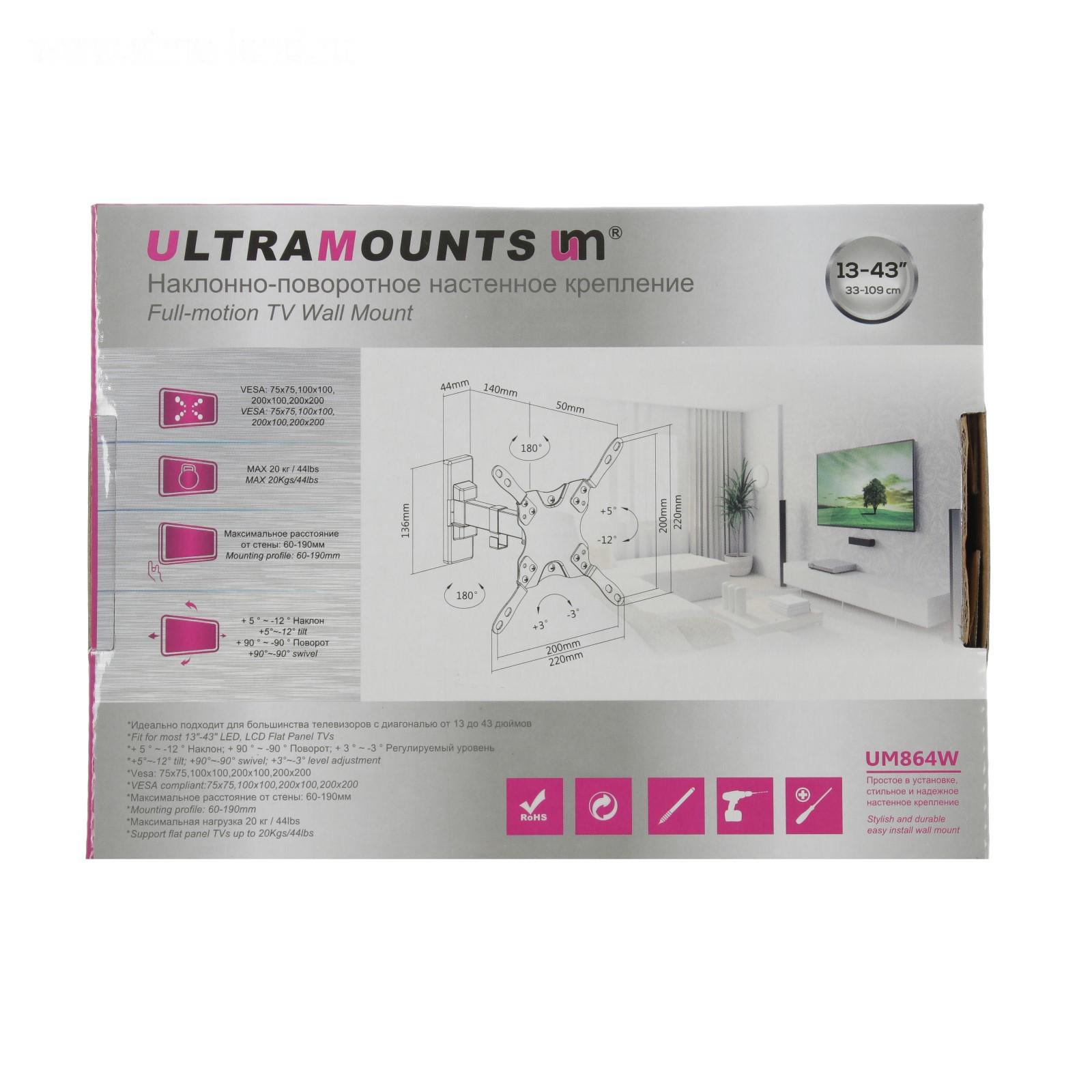 Кронштейн Ultramounts UM864W, для ТВ, наклонно-поворотный, 13-43", 60-190 мм от стены, белый