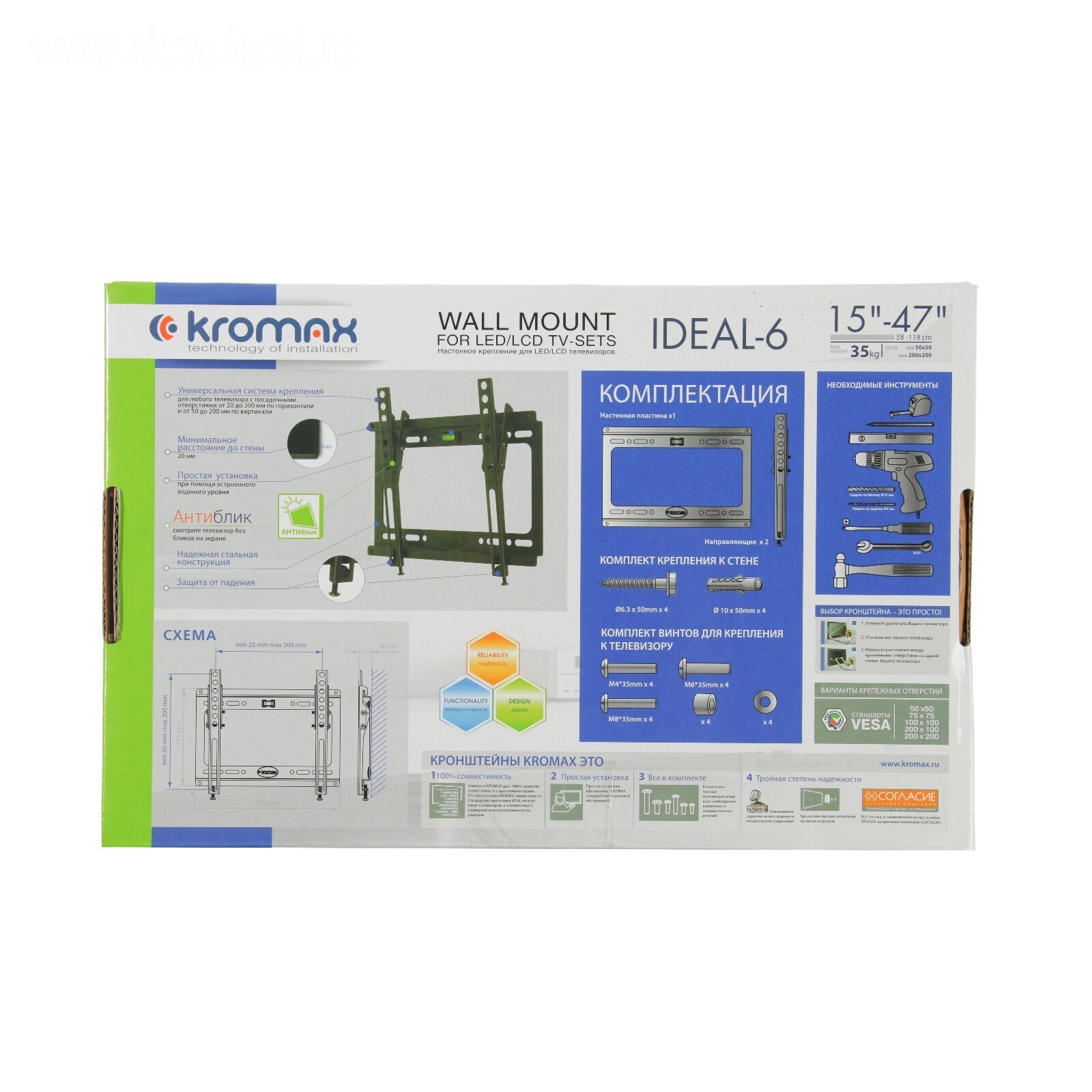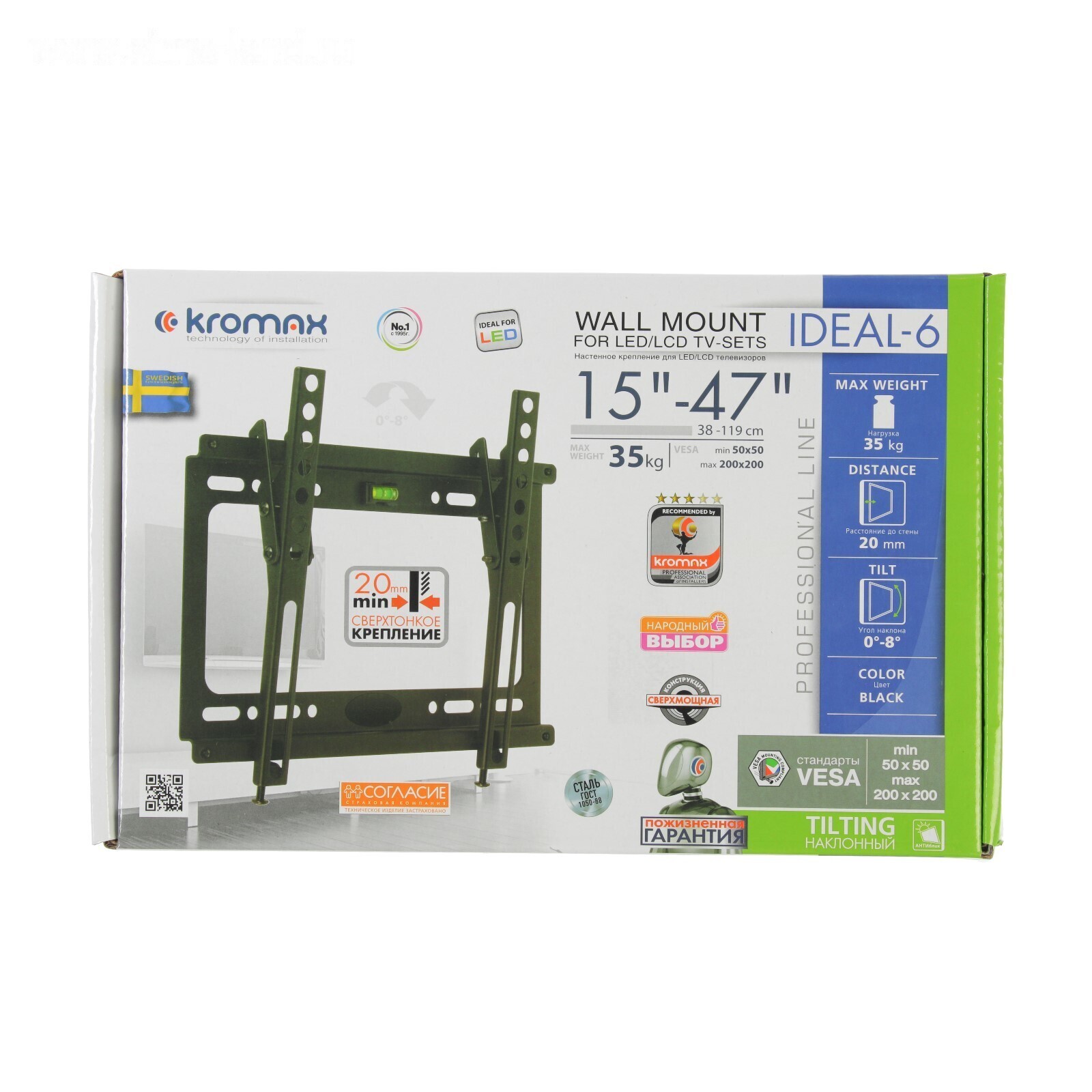 KROMAX IDEAL-6 BLACK надёжно удержит экран размером 15"-47" дюйма и весом 35 кг. Простая конструкция KROMAX IDEAL-6 BLACK идеально подойдет для самостоятельного монтажа. Наклонная конструкция регулировать экран вверх и вниз на 0-8°.