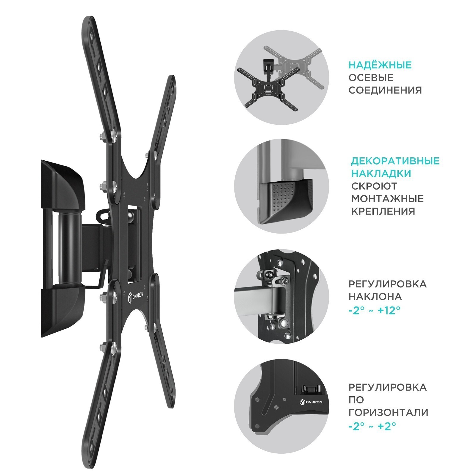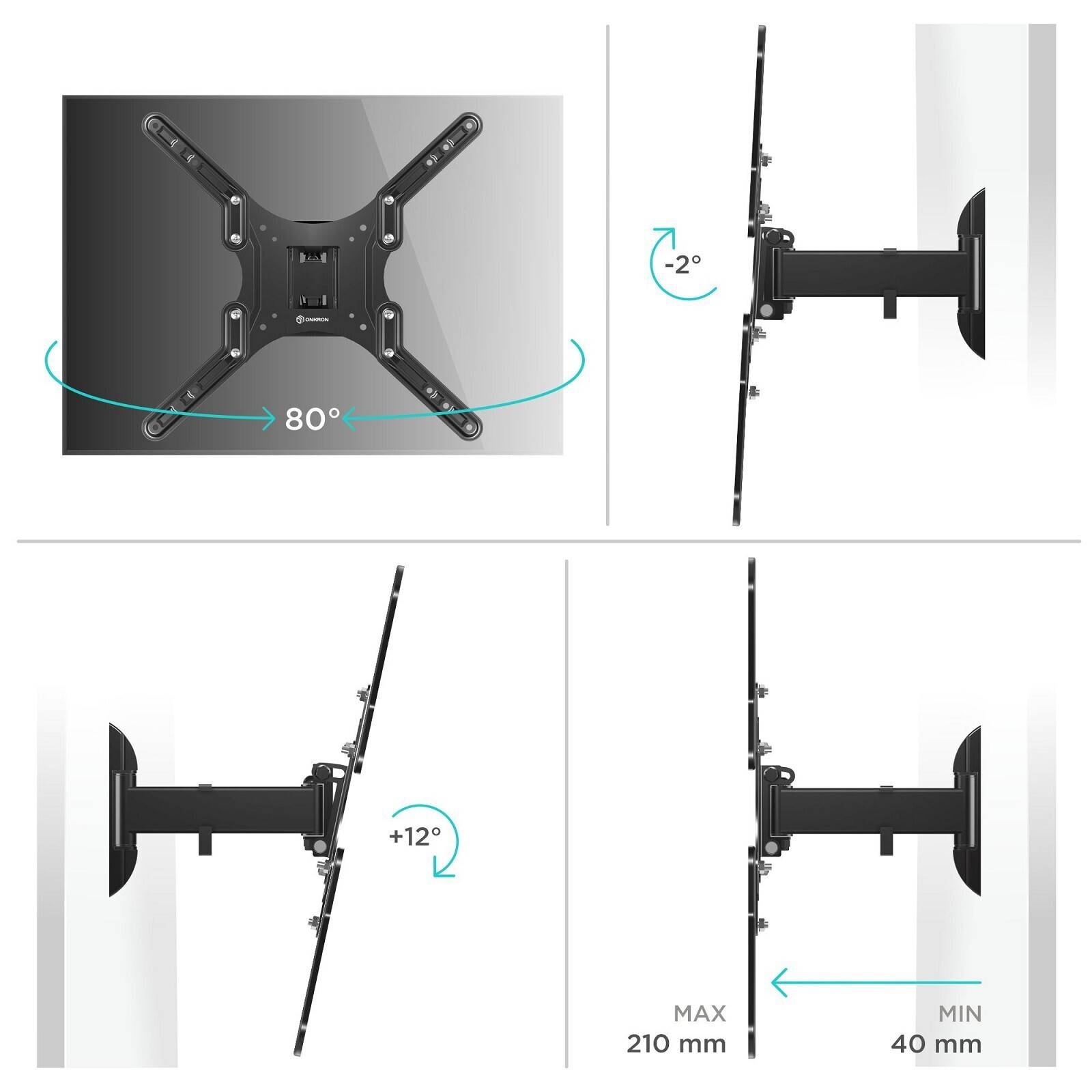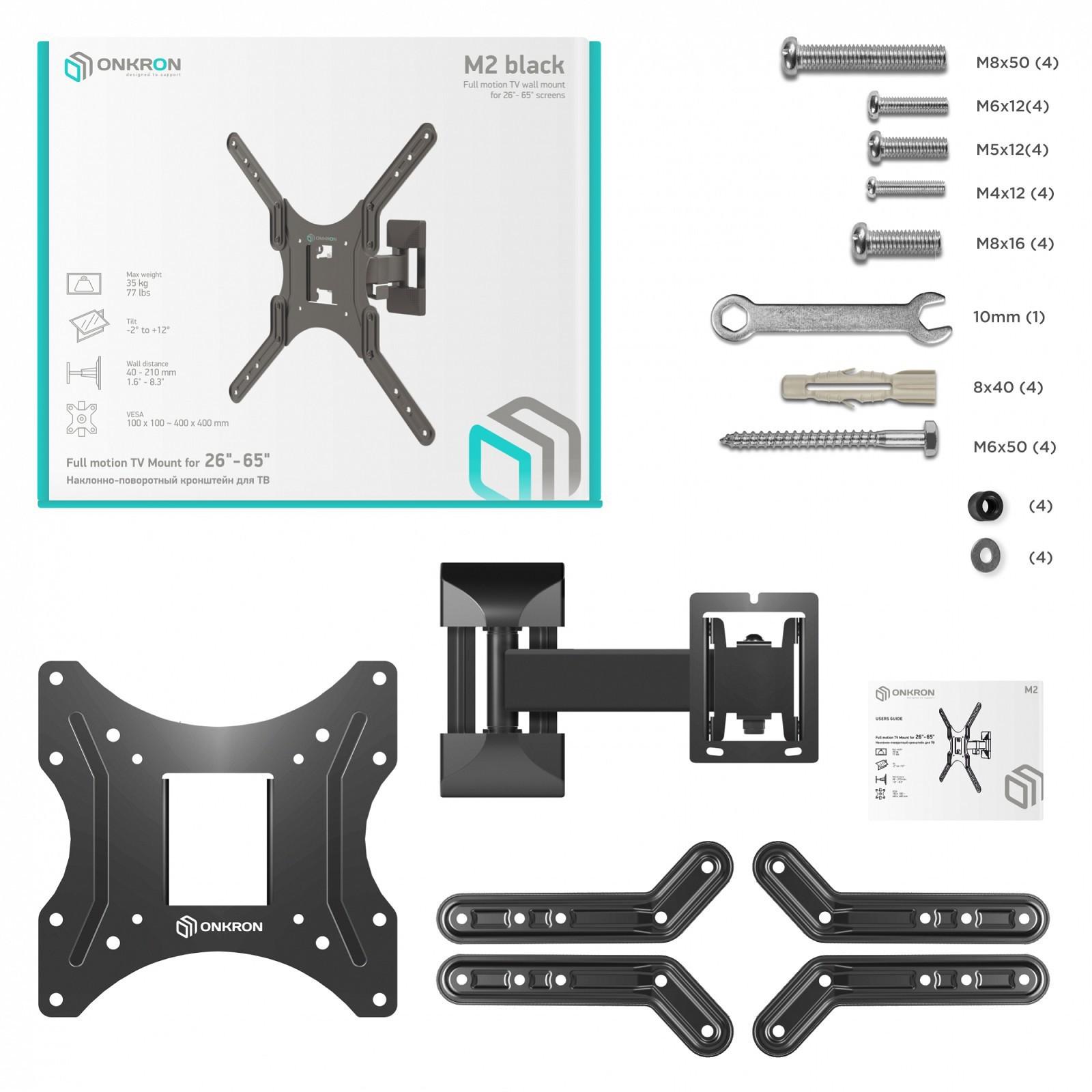 Кронштейн ONKRON M2, для ТВ, наклонно-поворотный, 26"-65", 40-210 мм от стены, черный
