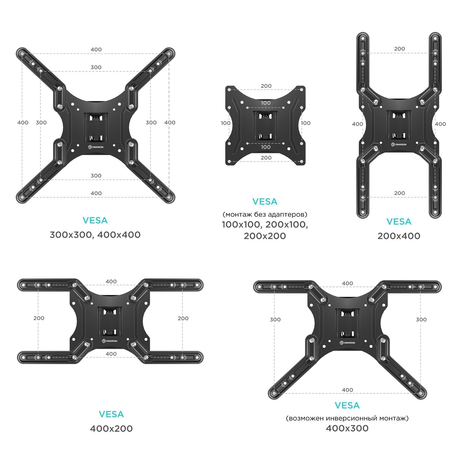 • Размер VESA 100 х 100, 200 х 100, 200 х 200, 200 х 300, 200 х 400, 300 х 200, 300 х 300, 400 х 200, 400 х 300, 400 х 400